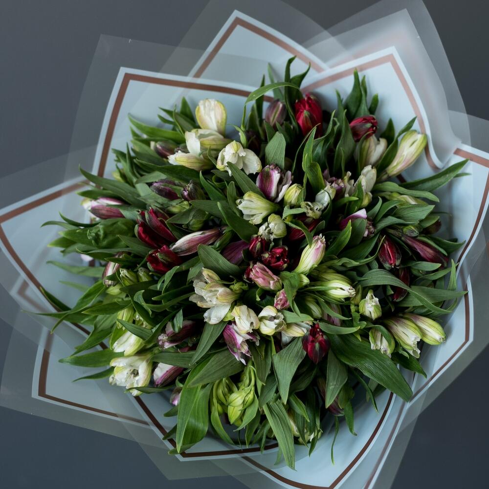 альстромерия микс – 25 шт.Корейская упаковка – 3 шт.Лента атласная – 2 шт.