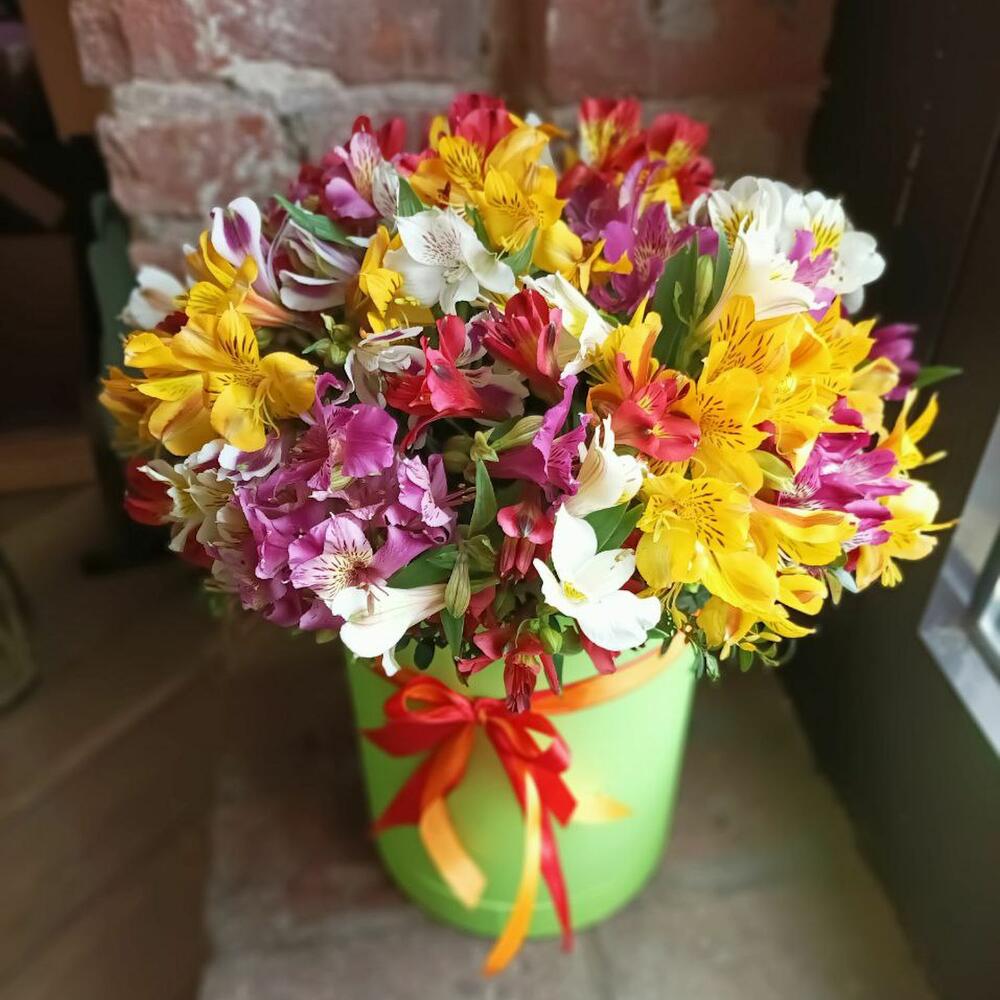 Букет из 35 разноцветных альстромерий в шляпной коробке “Ирэн Адлер”