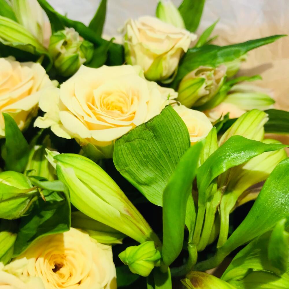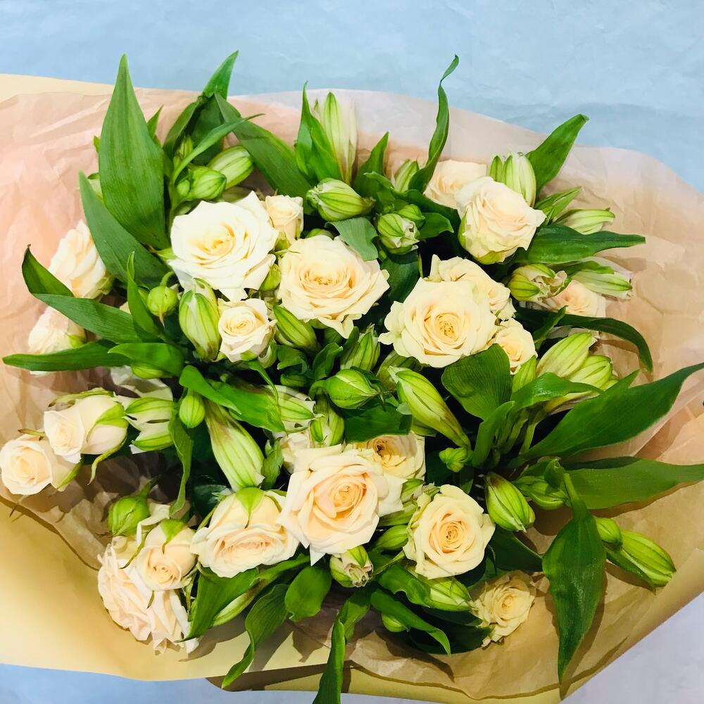 розы кустовые – 5 шт.Альстромерия – 7 шт.Упаковка дизайнерская – 4 шт.
