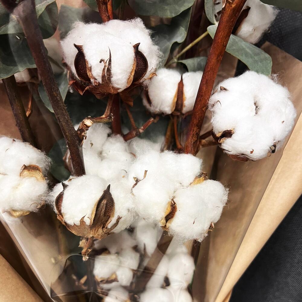 Ветка хлопка – 5 шт.Эвкалипт – 1 шт.Крафт – 1 шт.Прозрачная пленка – 1 шт.