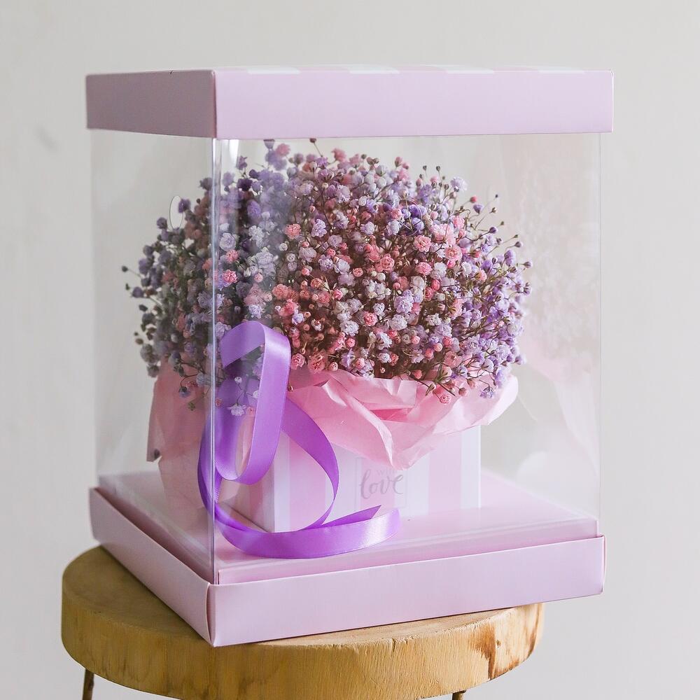 “Сиреневый туман” – композиция из гипсофилы в шляпной коробке