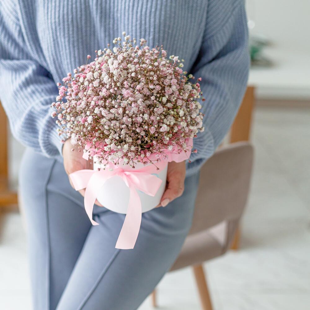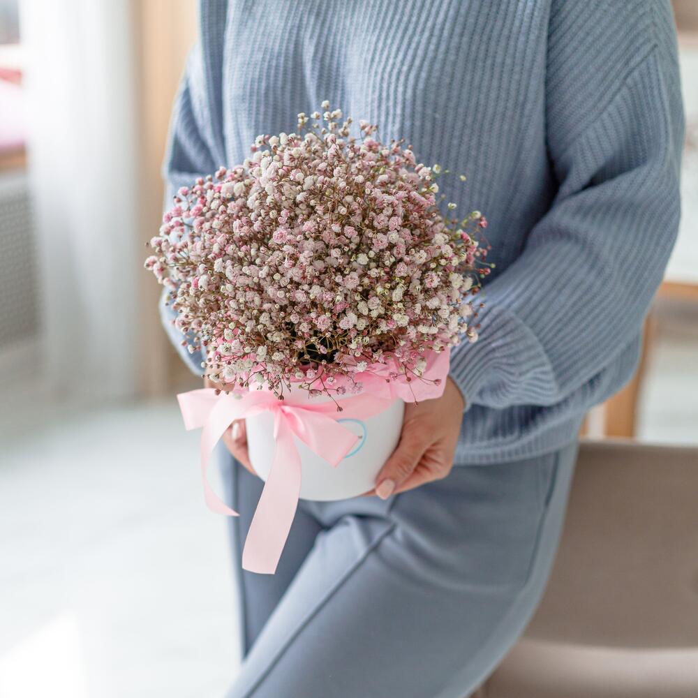 “Сиреневый туман” – композиция из гипсофилы в шляпной коробке