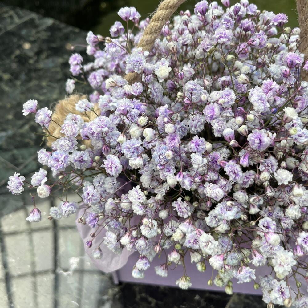 Композиция из гипсофилы в шляпной коробке «черника со льдом»
