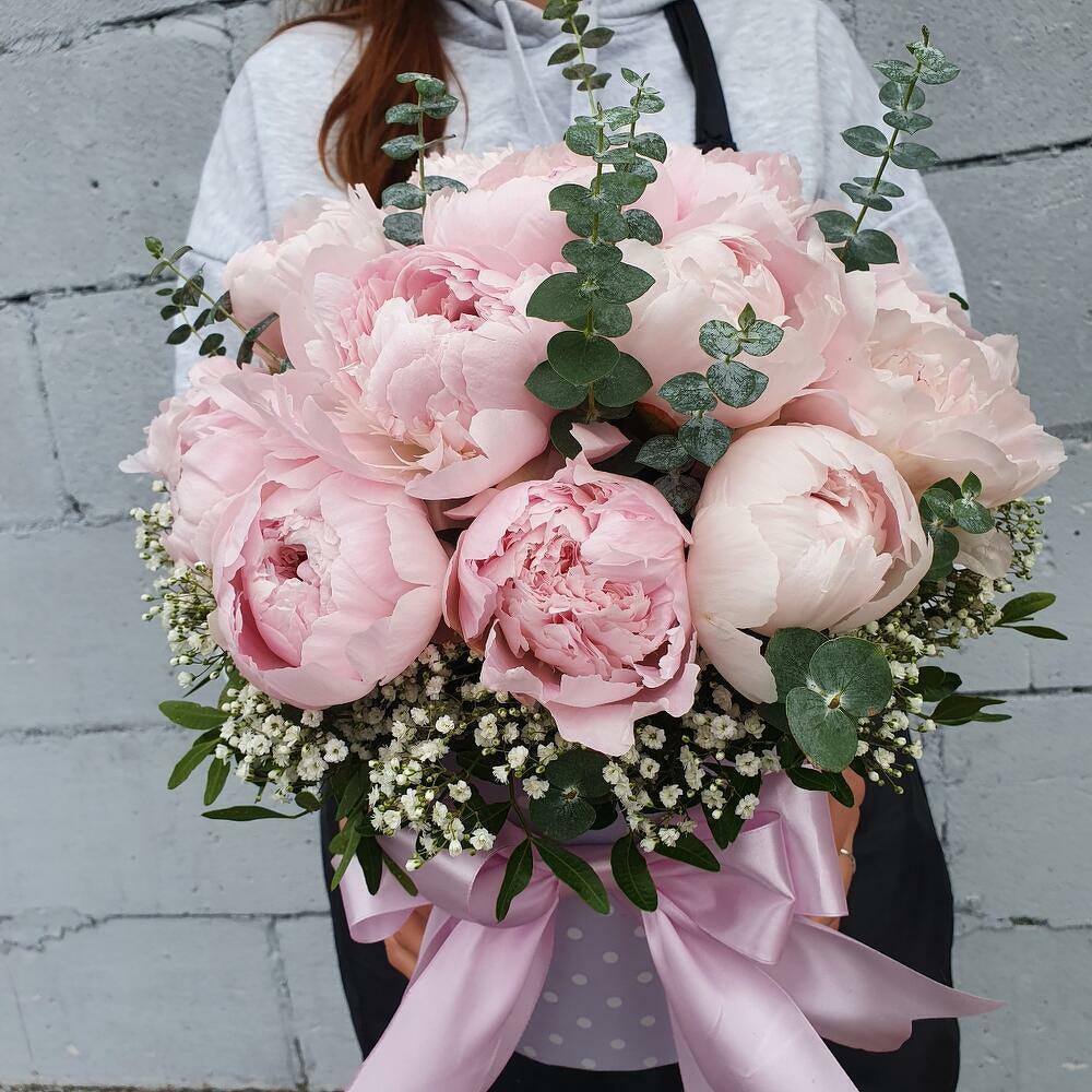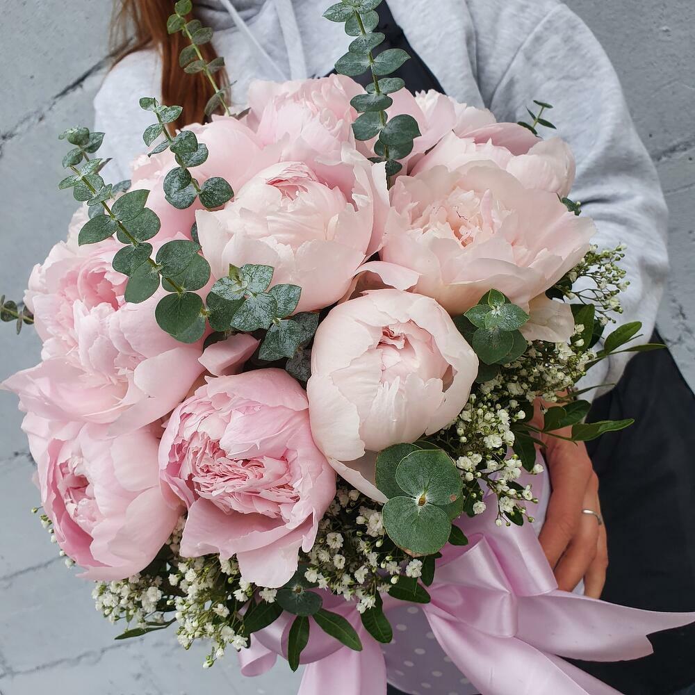 Пион – 19 шт.Эвкалипт – 5 шт.Гипсофила – 2 шт.Фисташка – 3 шт.Лента атласная – 1 шт.