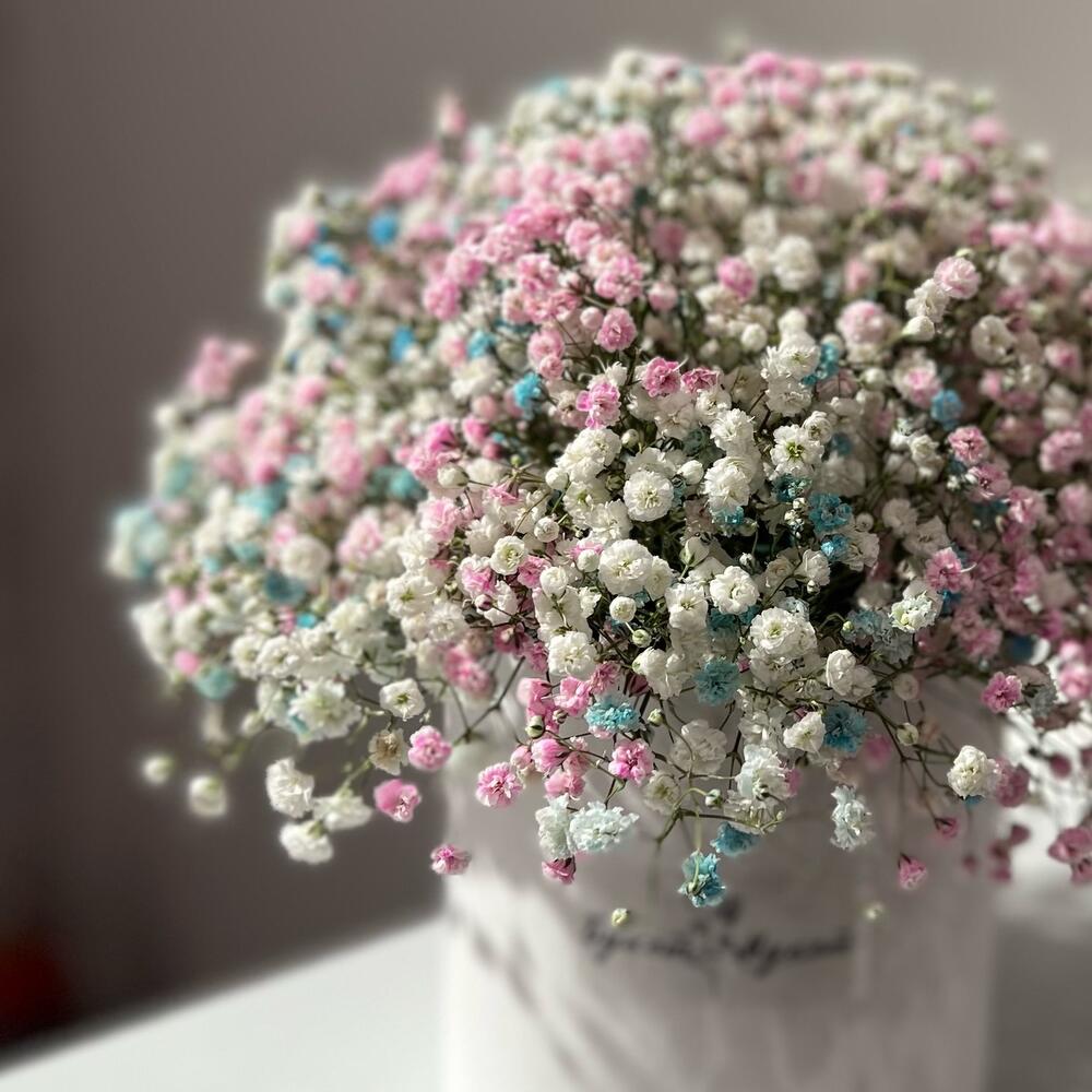 Коробка шляпная – 1 шт.Оазис флористический – 1 шт.гипсофила радужная – 4 шт.