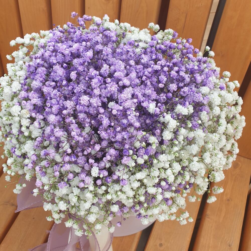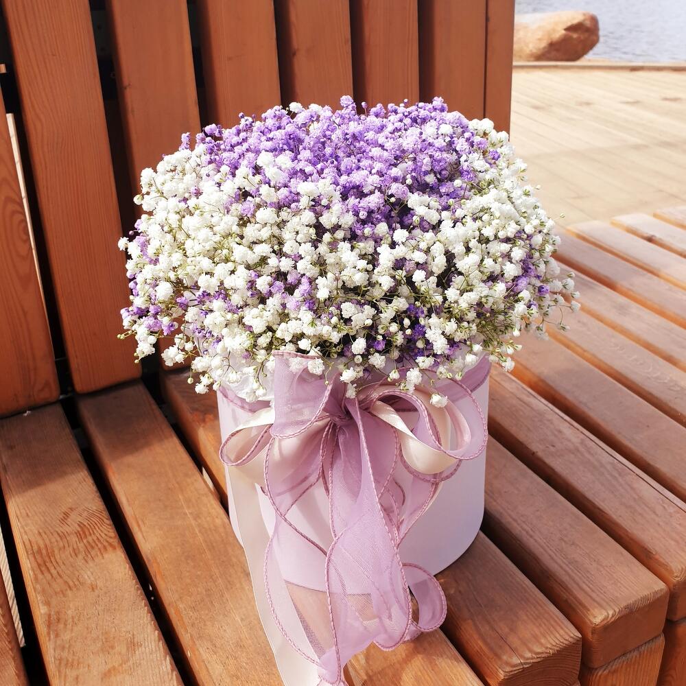 “Сиреневый туман” – композиция из гипсофилы в шляпной коробке