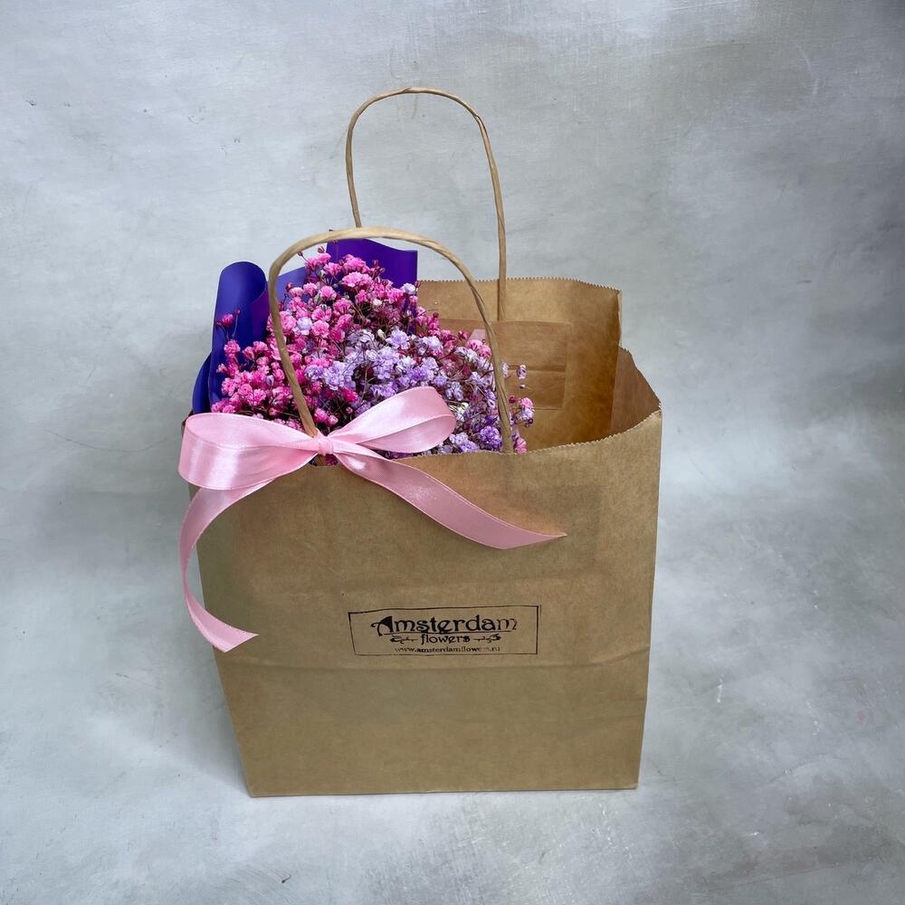 Подарочный набор – Букетик гипсофилы (размеры: 25 см высота, 20 см ширина) с коробкой конфет Raffaello. Доставляется в крафтовом пакете (высота 25 см, ширина 22 см, глубина 12 см).