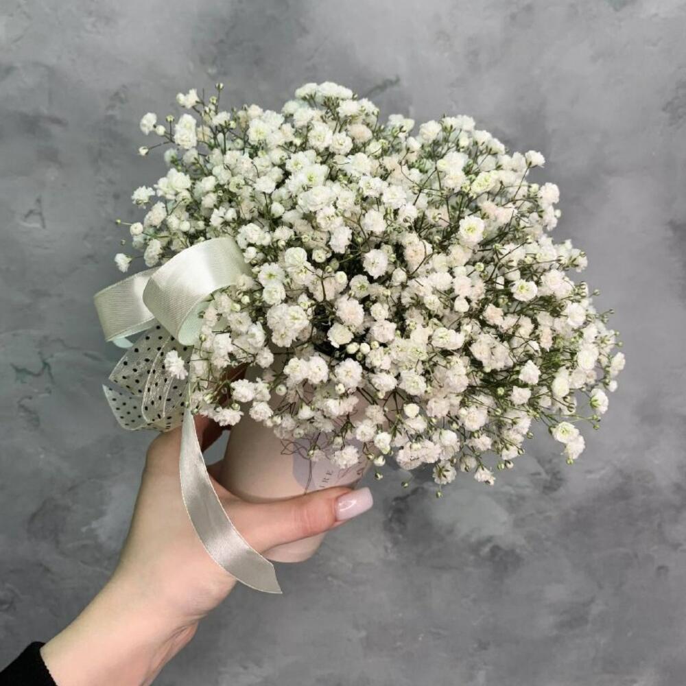 “Сиреневый туман” – композиция из гипсофилы в шляпной коробке