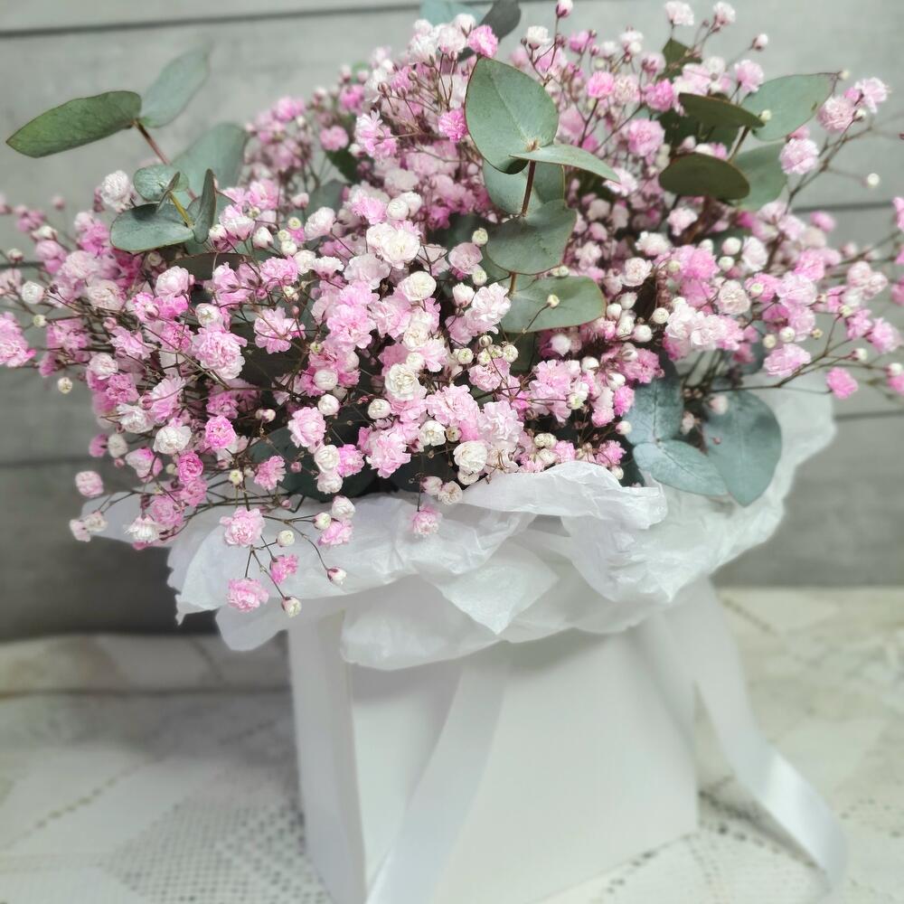 Гипсофила – 5 шт.Эвкалипт – 6 шт.сумочка картонная с лентами – 1 шт.Тишью – 1 шт.Губка флористическая – 1 шт.