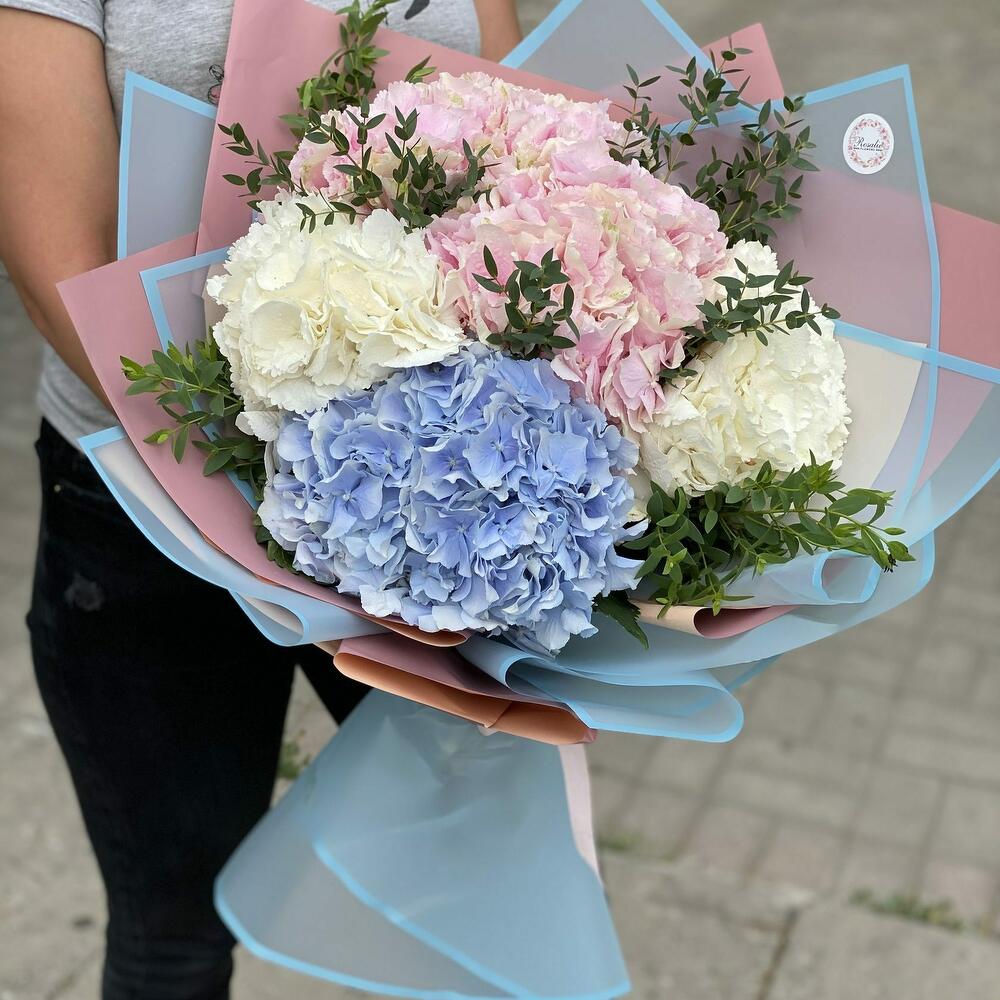 Гвоздики, Гортензии, Кустовые розы, Лизиантусы, Пионовидные розы, Розы