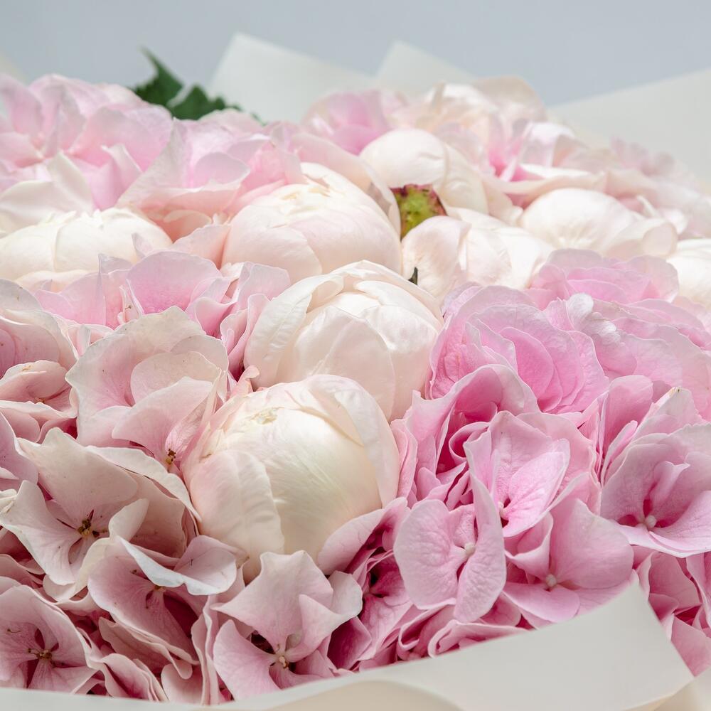 гортензия премиум розовая – 4 шт.пион белые премиум класса – 13 шт.Упаковка дизайнерская – 2 шт.хорошее настроение – 5 шт.Лента атласная – 3 шт.