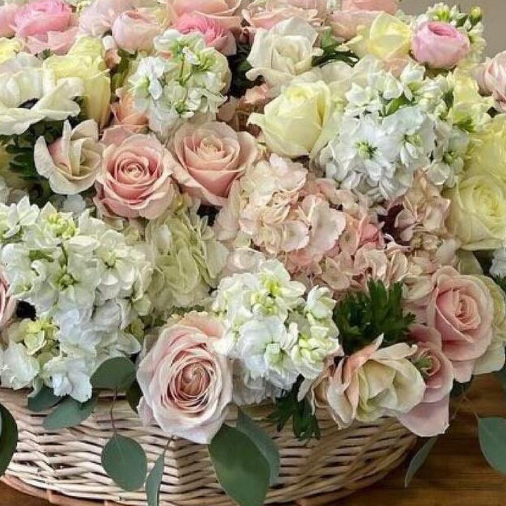 розы одноголовые – 40 шт.Маттиола – 45 шт.Гортензия – 10 шт.Корзина плетеная – 1 шт.Открыточка с вашими пожеланиями – 1 шт.хорошое настроение – 100 шт.инструкция по уходу за цветами – 1 шт.Оазис флористический – 1 шт.Кризал – 1 шт.
