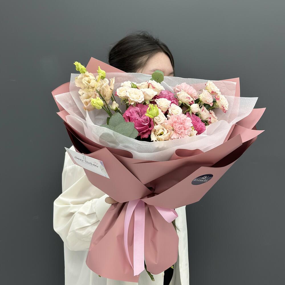 Гвоздики, Лизиантусы, Розы, Тюльпаны