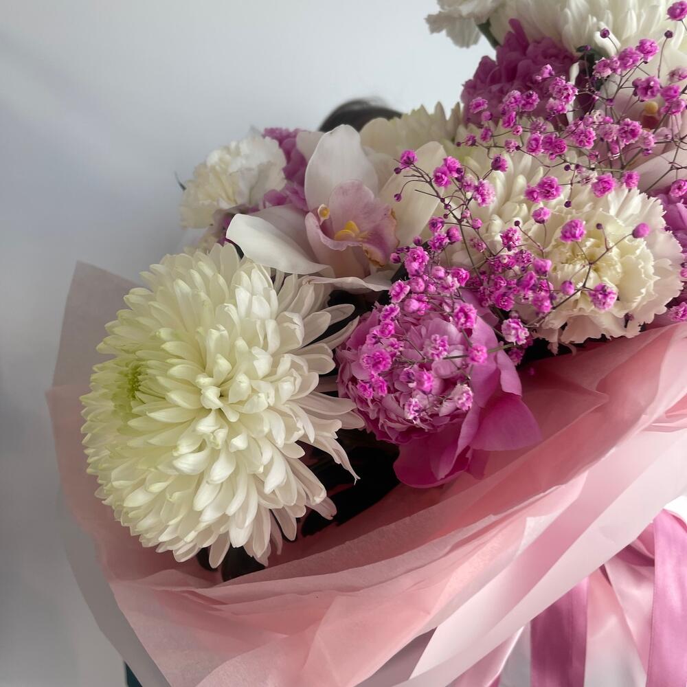 Гипсофила – 1 шт.Орхидея Цимбидиум – 3 шт.Пион – 6 шт.Хризантема – 5 шт.Тишью – 4 шт.Фисташка – 3 шт.Пленка матовая – 6 шт.Диантус сортовой – 3 шт.