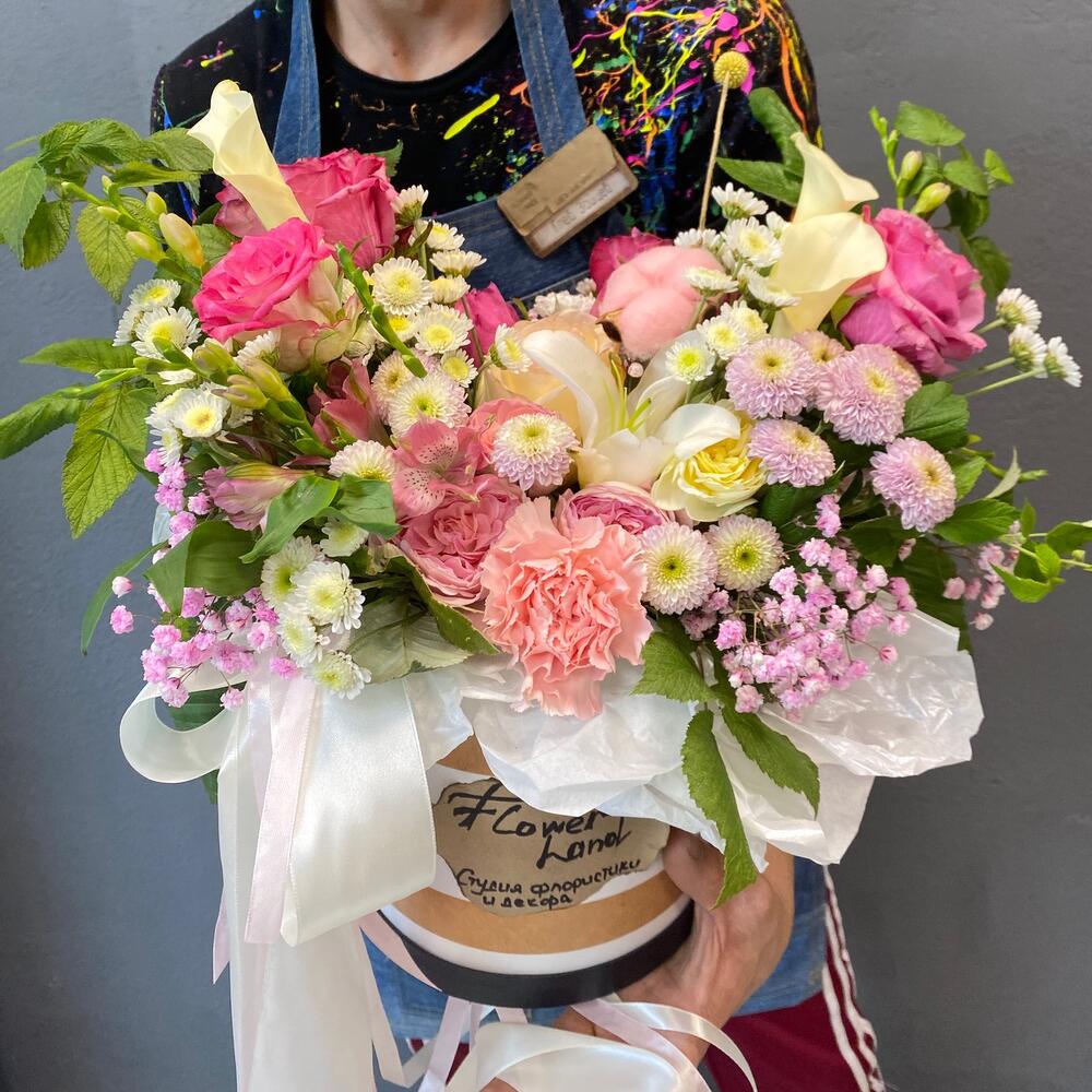 Альстромерия – 2 шт.Гипсофила – 1 шт.Хлопок – 2 шт.Зелень – 5 шт.Диантус – 1 шт.Сантини – 5 шт.каалы – 4 шт.розы микс – 6 шт.