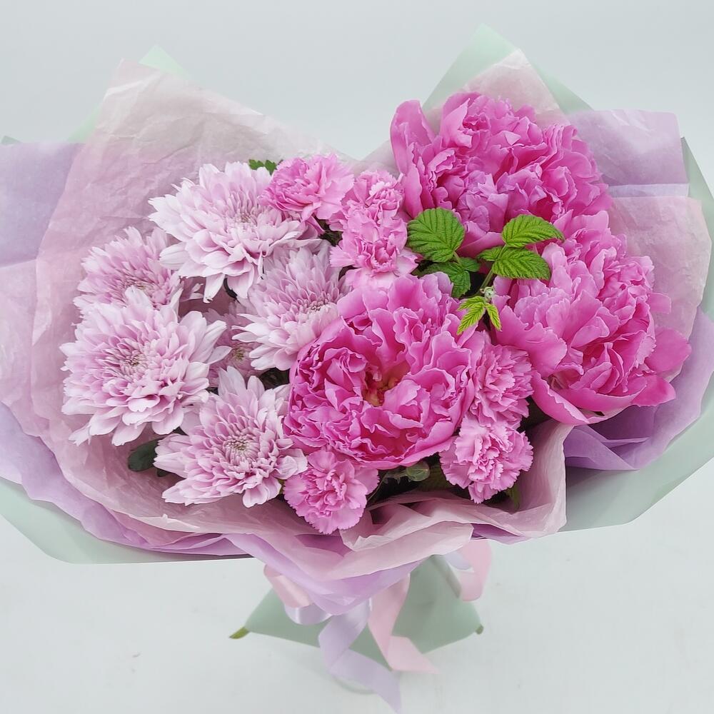 Пион – 3 шт.Хризантема кустовая – 1 шт.Гвоздика кустовая – 2 шт.Упаковка дизайнерская – 1 шт.рубус зелень – 1 шт.