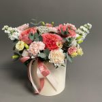 Маттиола – 2 шт.Озотамнус – 2 шт.Эвкалипт – 3 шт.Эустома – 4 шт.Лента атласная – 2 шт.Диантус – 5 шт.Коробка шляпная – 1 шт.Оазис флористический – 1 шт.розы – 3 шт.