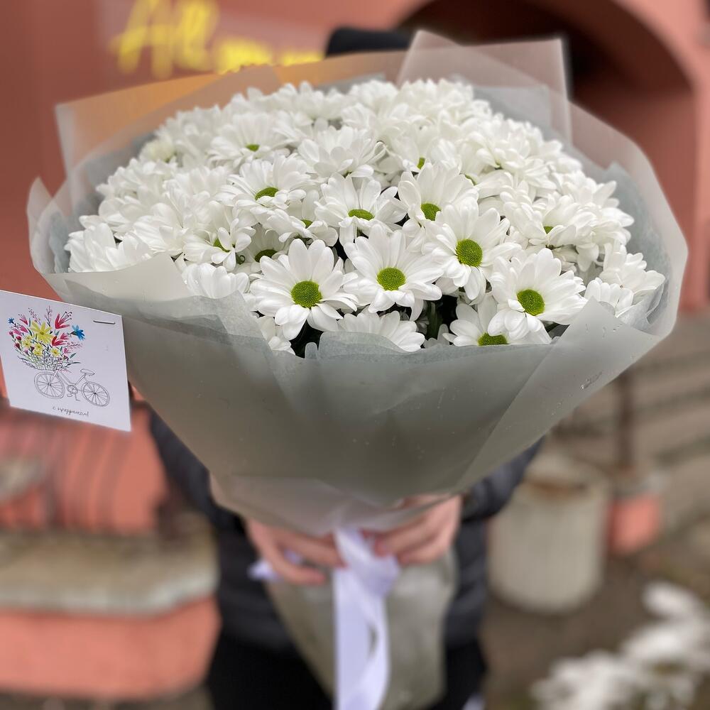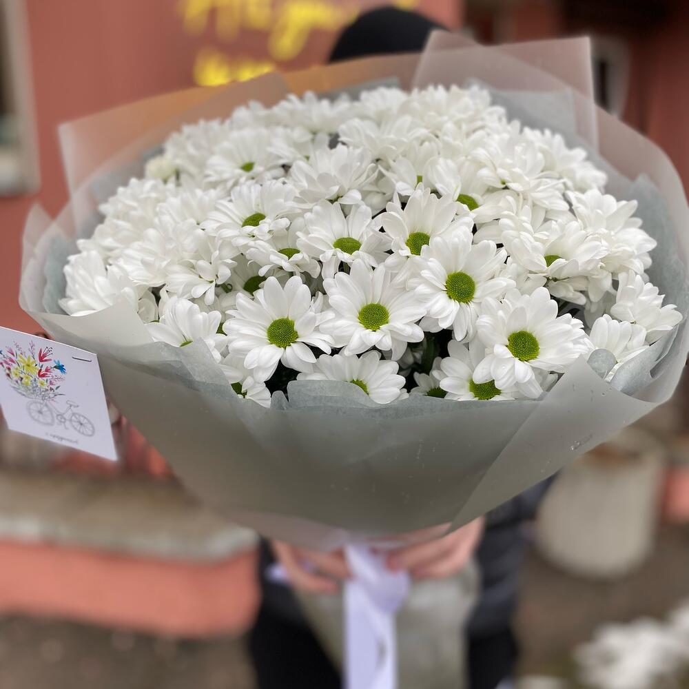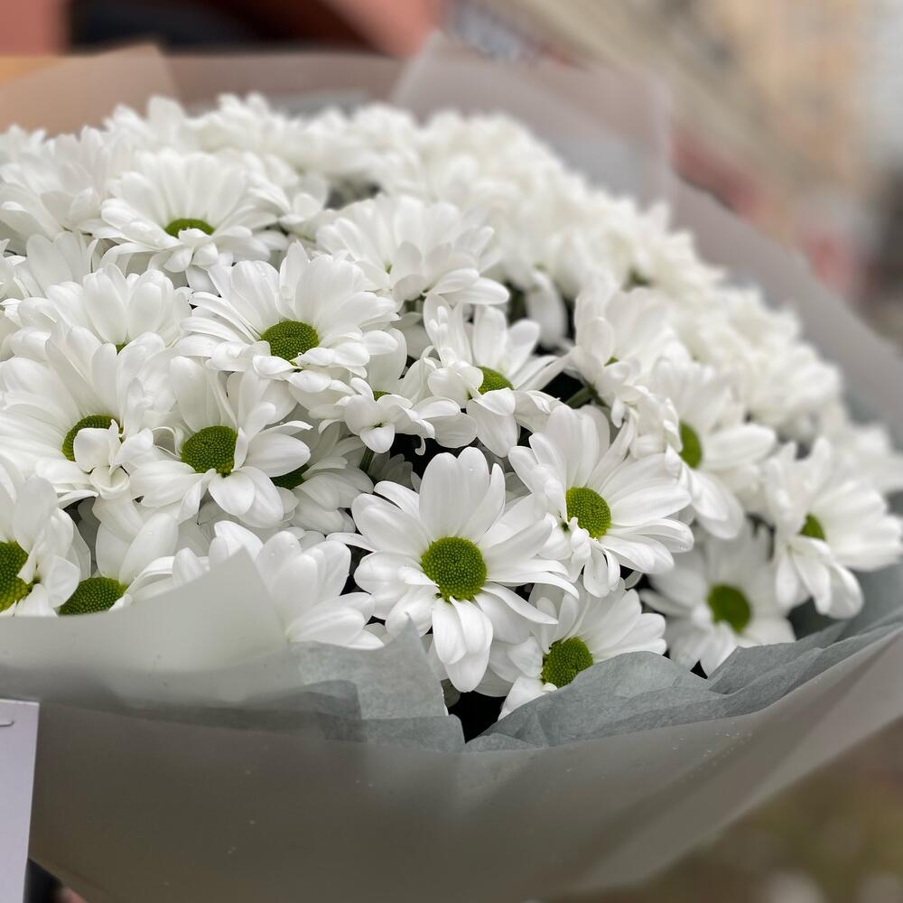 Букет из 11 веток ромашковых хризантем с оформлением , количество ромашек в букете может достигать 101 штуки .
