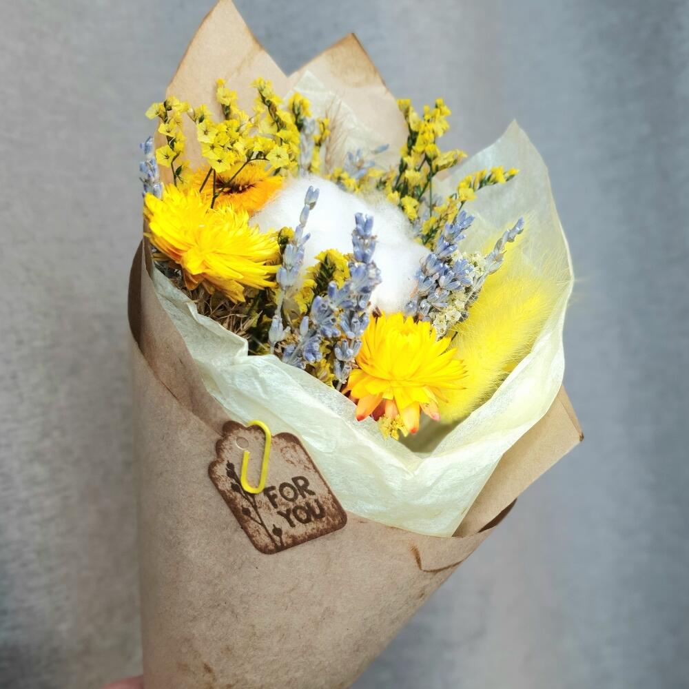 Хлопок натуральный – 1 шт.лавандин пучок – 1 шт.Гелихризум – 3 шт.Лагурус – 3 шт.статица стабилизированная пучок – 1 шт.Упаковка дизайнерская – 2 шт.