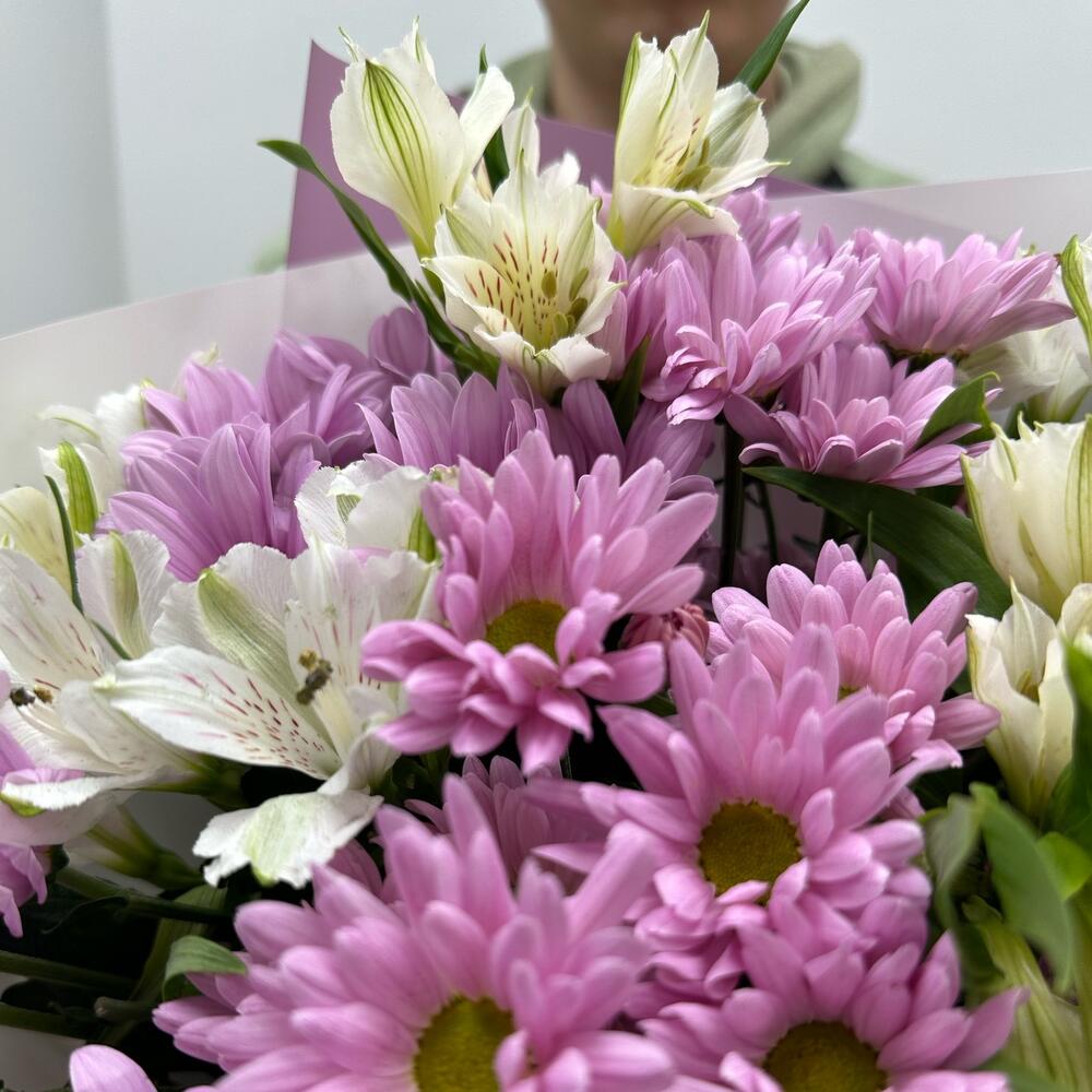 Альстромерия – 4 шт.Лента атласная – 1 шт.Упаковка дизайнерская – 1 шт.Хризантема кустовая цветная – 5 шт.