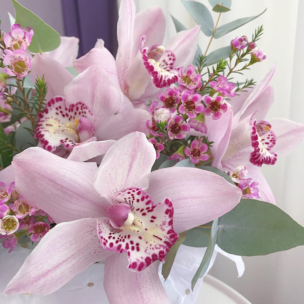 Орхидея Цимбидиум – 11 шт.Хамелациум – 3 шт.Эвкалипт – 3 шт.Лента атласная – 2 шт.