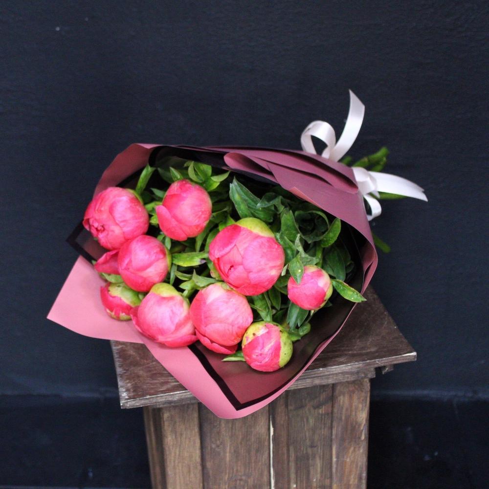 Лента атласная – 2 шт.Пленка дизайнерская – 3 шт.пион coral charm – 9 шт.
