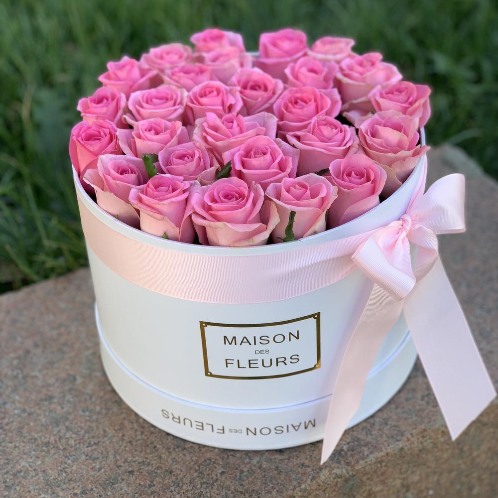 25 розовых роз в белой коробке