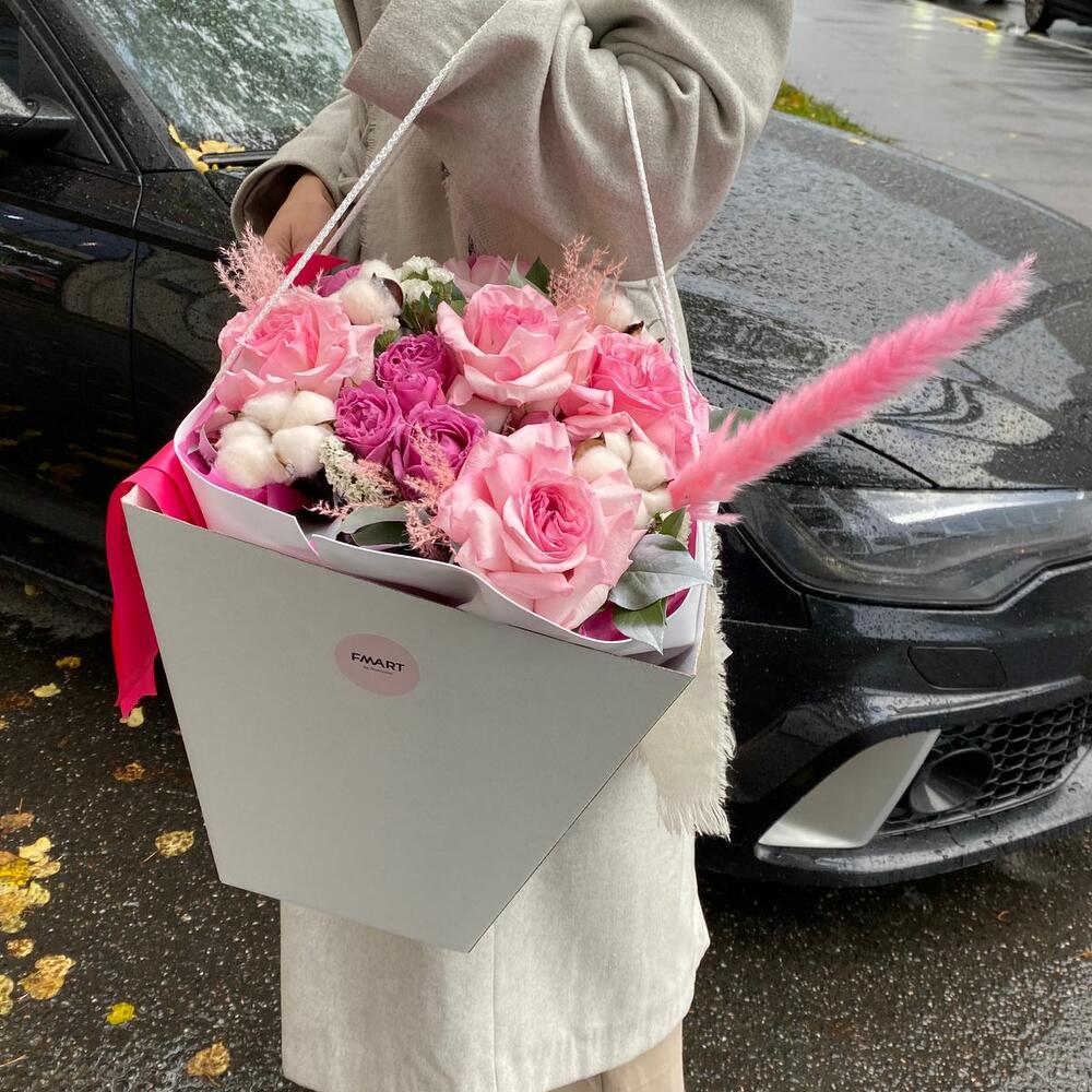 pink o’hara – 5 шт.камыш – 1 шт.Хлопок – 5 шт.Роза пионовидная кустовая – 3 шт.Упаковка – 4 шт.Салал – 5 шт.Статица – 2 шт.мискантус – 4 шт.