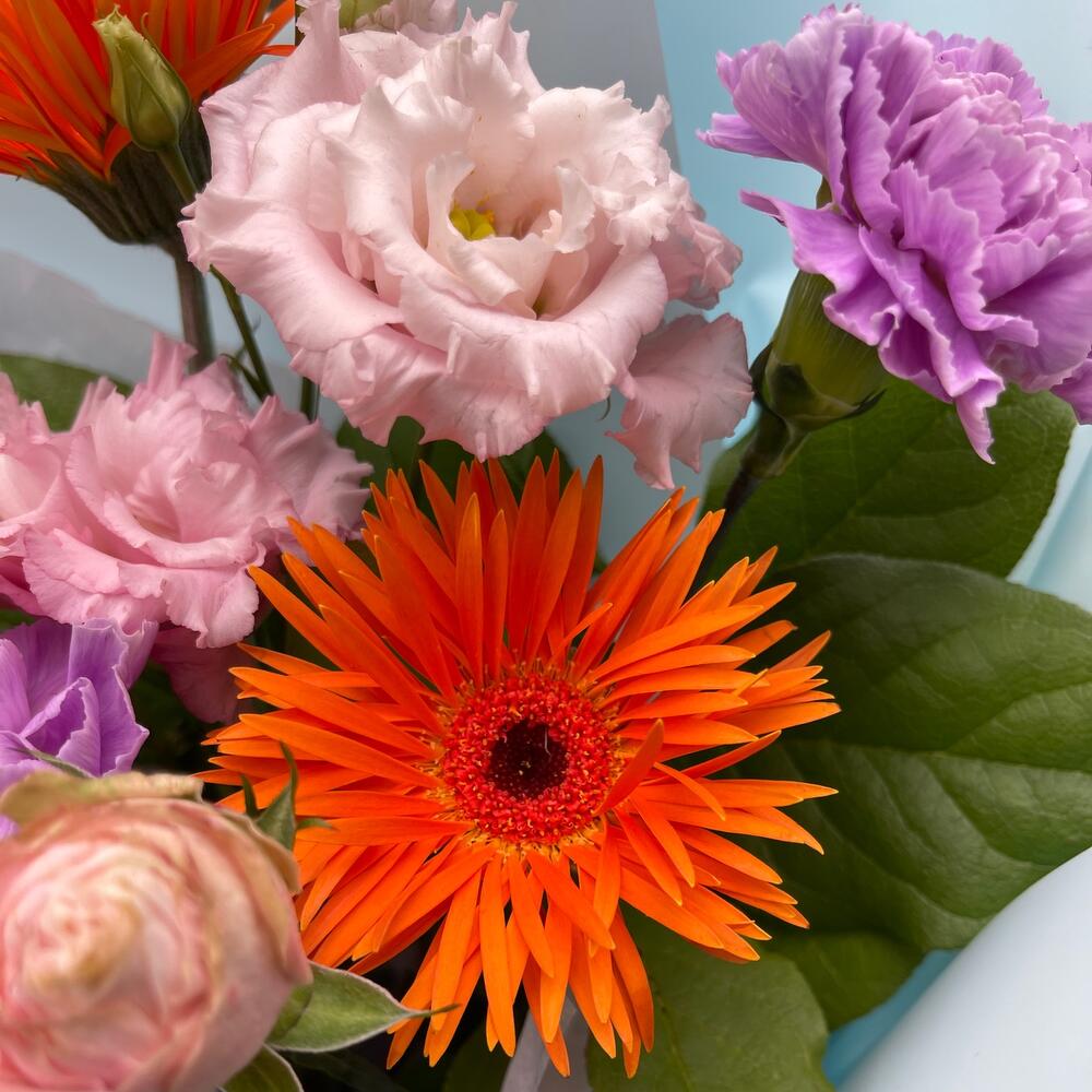 гербера мохровая – 2 шт.Диантус – 3 шт.Салал – 2 шт.Роза оранжевая – 2 шт.Роза пионовидная кустовая – 1 шт.Лизиантус – 1 шт.Упаковка дизайнерская – 3 шт.