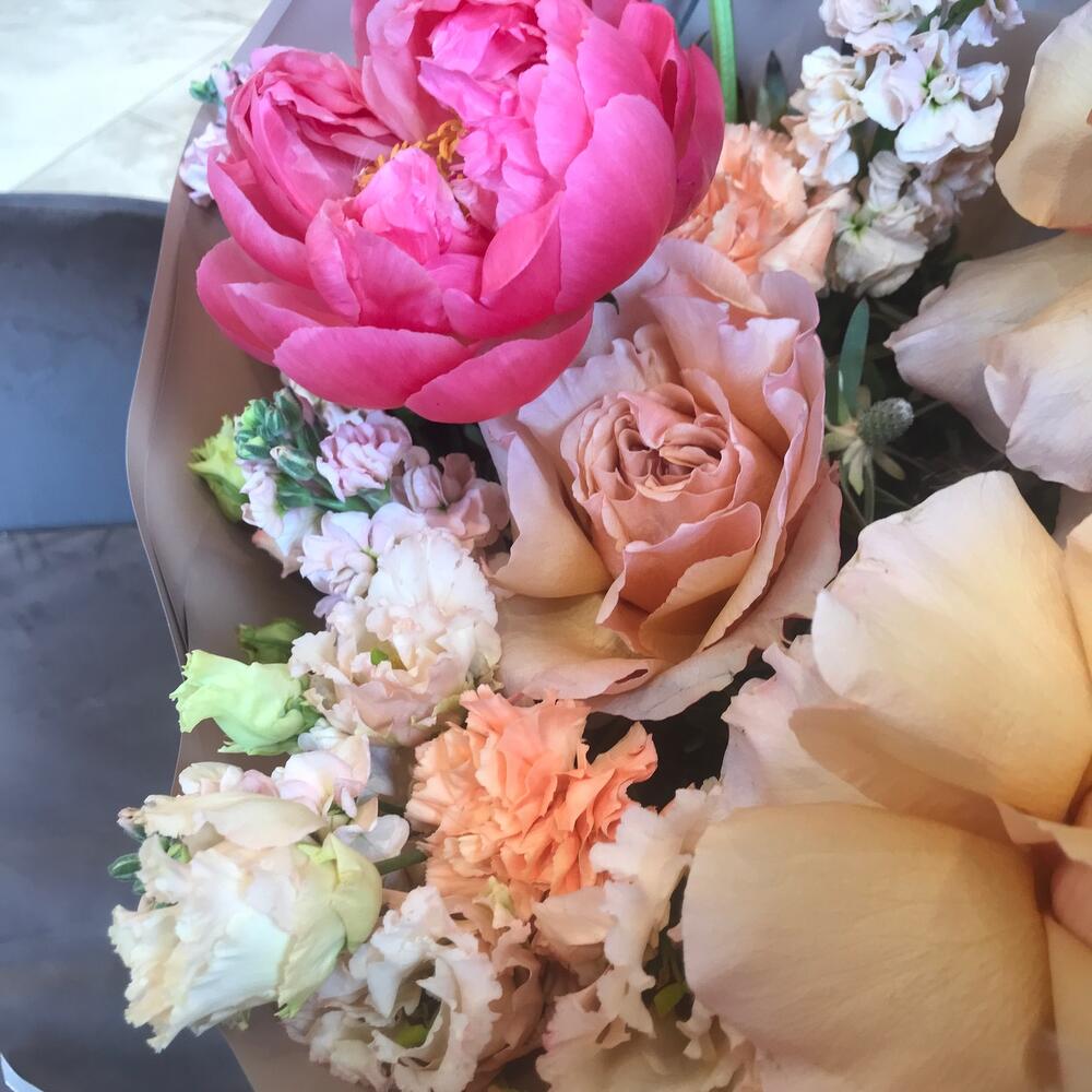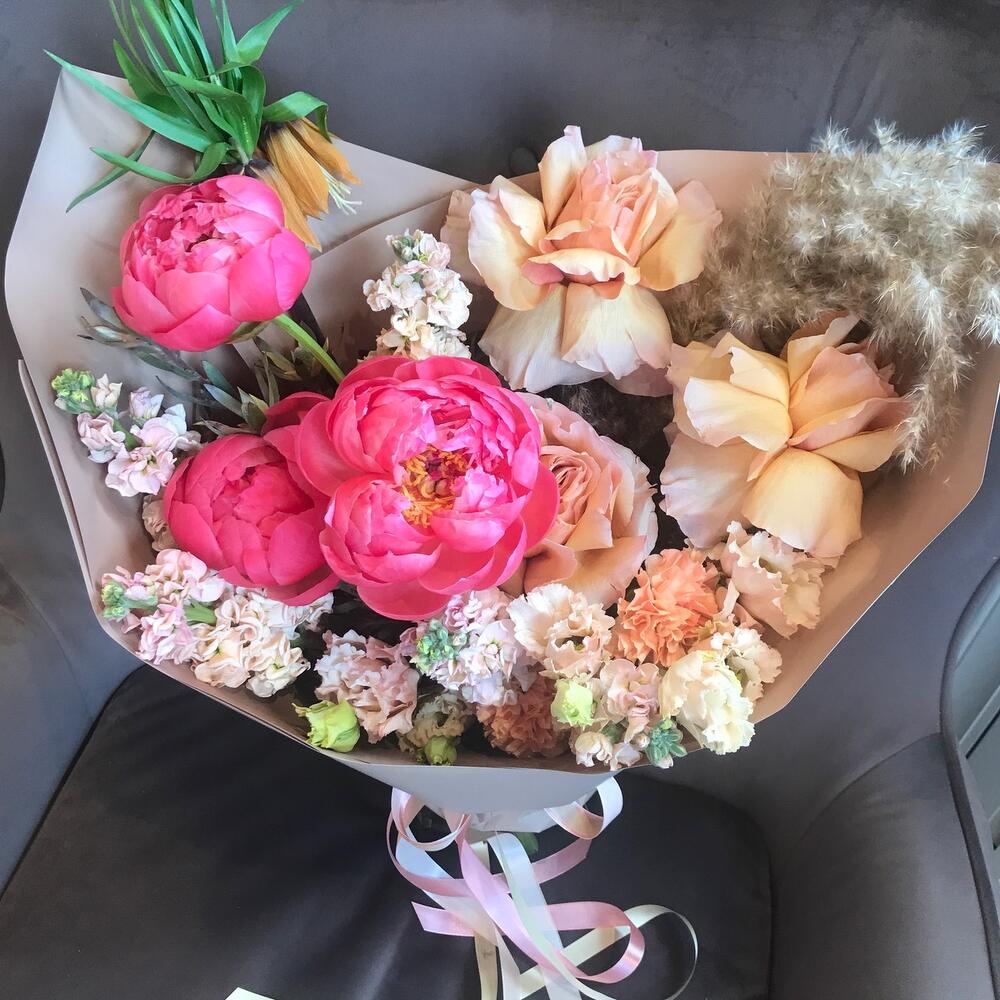 Пион коралл шарм – 3 шт.роза эквадор крупный бутон – 3 шт.Фритиллярия – 1 шт.Лизиантус – 1 шт.маттиола кремовая – 5 шт.Диантус – 5 шт.Сафари кустовой – 2 шт.Фисташка – 1 шт.Пленка матовая – 3 шт.Лента атласная – 3 шт.