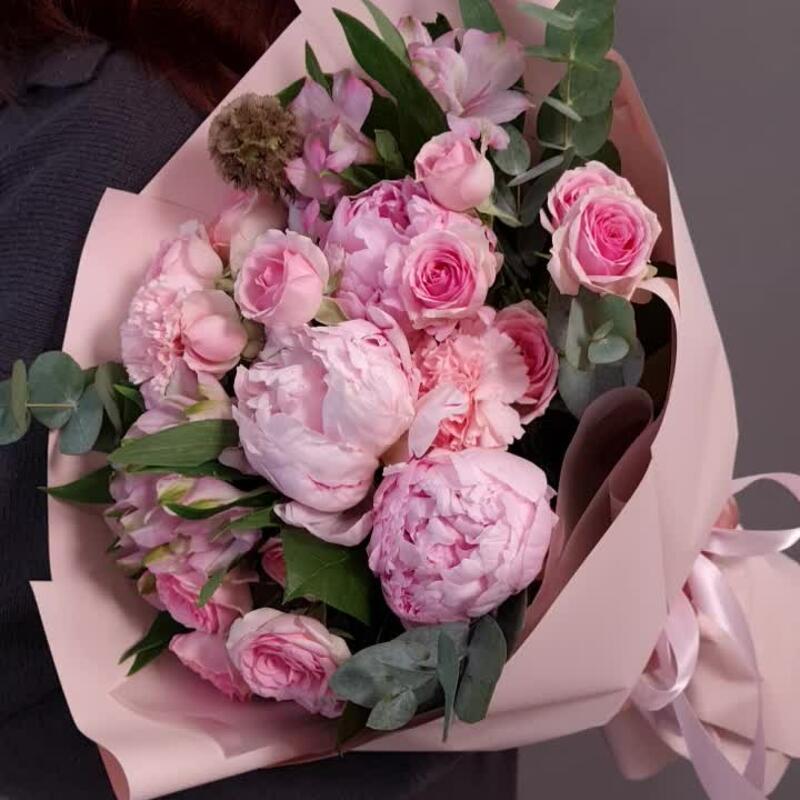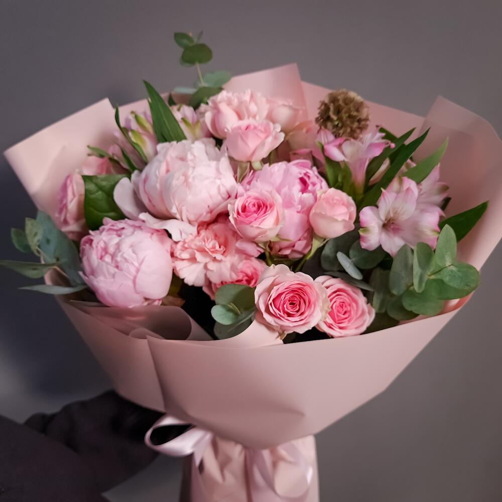 Альстромерия – 2 шт.Эвкалипт – 2 шт.Пион Сара Бернар – 3 шт.Упаковка дизайнерская – 1 шт.Аквапак – 1 шт.Диантус розовый – 2 шт.Средство для продления жизни цветов – 2 шт.Скабиоза стелата – 1 шт.роза кустовая динара – 3 шт.
