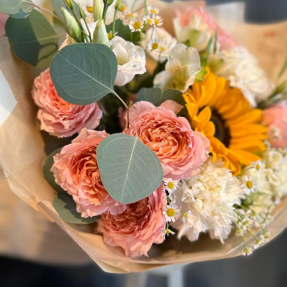 Пионовидная роза джульетта – 4 шт.Диантус – 3 шт.Эустома – 1 шт.Ромашка – 2 шт.Роза кустовая – 3 шт.подсолнух (гелиантус) – 1 шт.Эвкалипт – 2 шт.