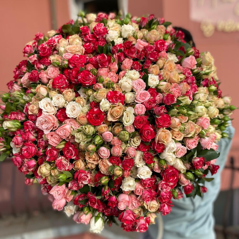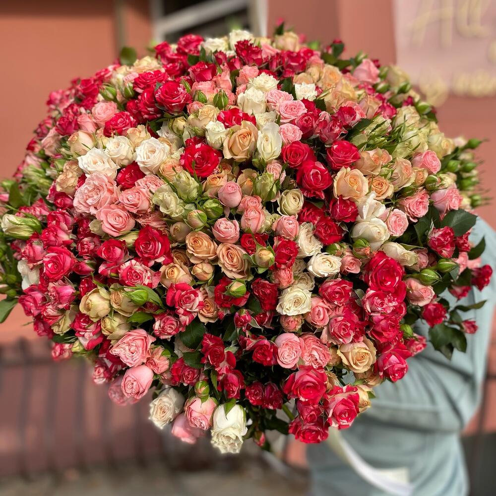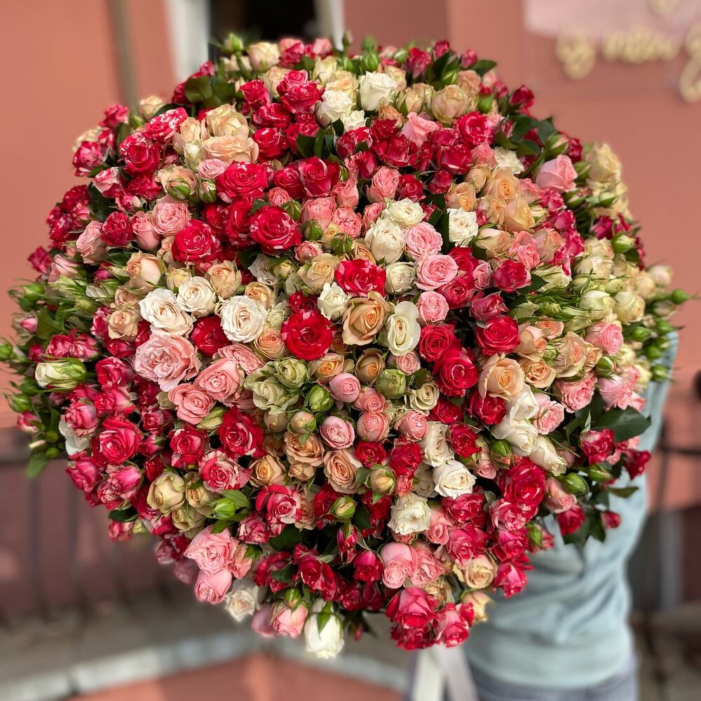 Букет из 101 ветки кустовых роз , разных сортов . Количество бутонов (розочек) может достигать 1001 штуки.