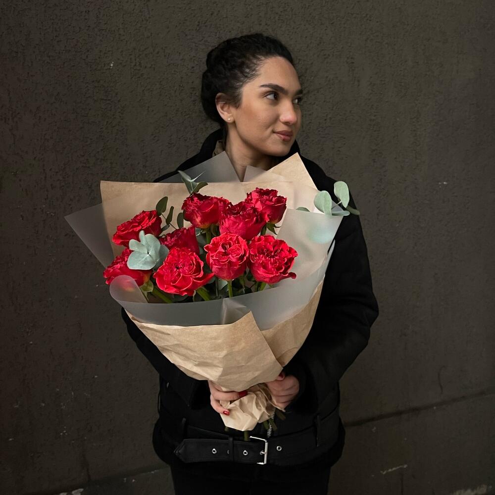 Эвкалипт – 3 шт.Роза пионовидная – 9 шт.Упаковка дизайнерская – 3 шт.
