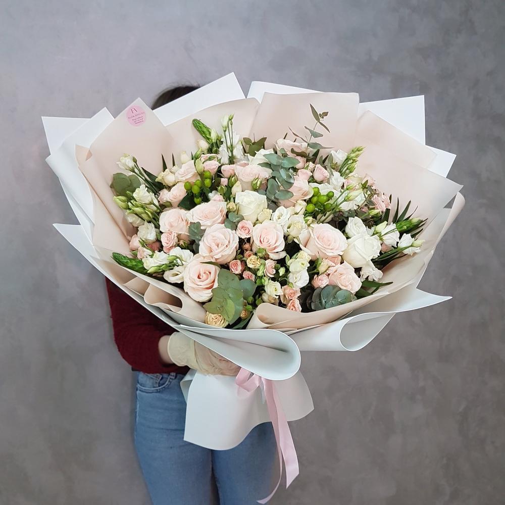 роза кения 60 см – 17 шт.Роза кустовая розовая – 5 шт.Роза кустовая кремовая – 2 шт.эустома белая – 5 шт.Гиперикум белый – 3 шт.львиный зев или маттиола – 5 шт.Эвкалипт – 10 шт.Пленка матовая – 4 шт.Фоамиран – 4 шт.Лента атласная – 2 шт.
