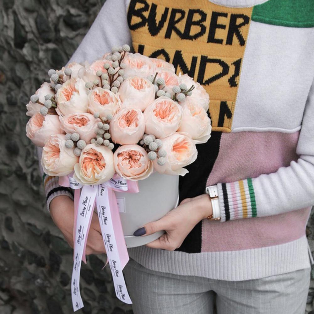 Роза пионовидная – 19 шт.Бруния – 10 шт.Лента – 2 шт.Коробка – 1 шт.