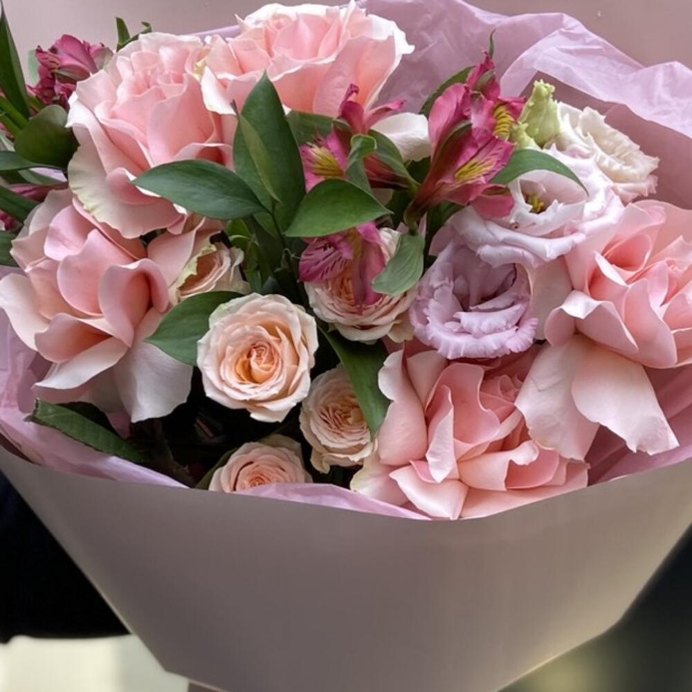 Альстромерия – 2 шт. Рускус – 2 шт. Кустовая роза – 1 шт. Эустома – 1 шт. Упаковка дизайнерская – 1 шт. французская роза пинк мондиаль – 5 шт.