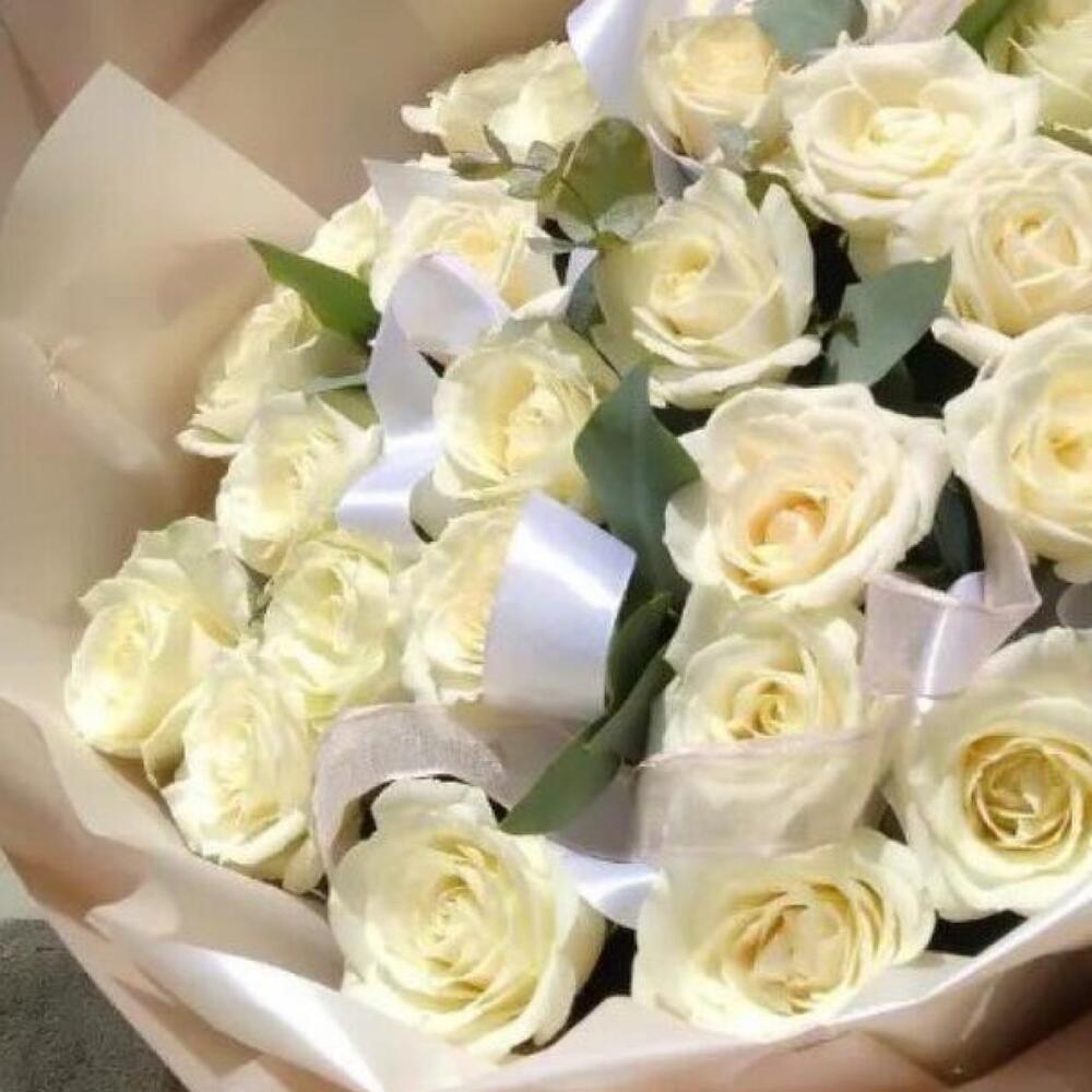 Роза белая – 51 шт.Упаковка дизайнерская – 2 шт.Лента атласная – 2 шт.Открыточка с вашими пожеланиями – 1 шт.хорошее настроение – 100 шт.инструкция по уходу за цветами – 1 шт.коробка переноска – 1 шт.Кризал – 1 шт.