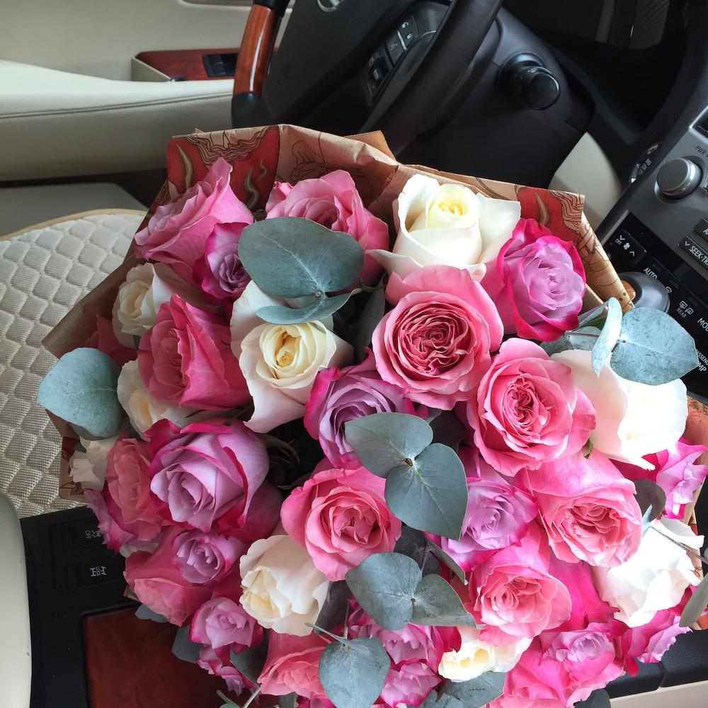 Прекрасный, объемный и стильный букет из 51 разноцветной розы выполненный в нежных оттенках роз, с добавлением зелени эвкалипта и упакованный в бумагу крафт.