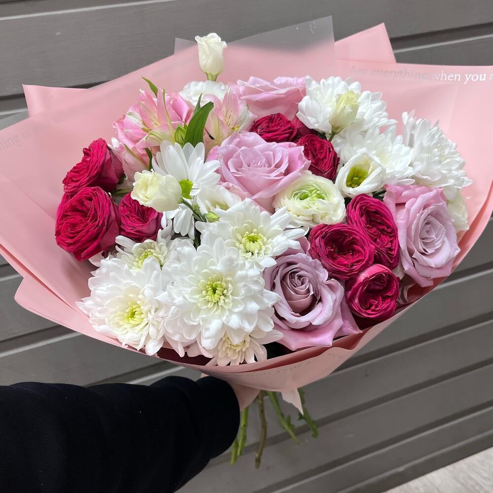 Альстромерия – 1 шт.Хризантема кустовая – 3 шт.Роза – 5 шт.Кустовая роза – 3 шт.Эустома – 2 шт.Оформление – 1 шт.