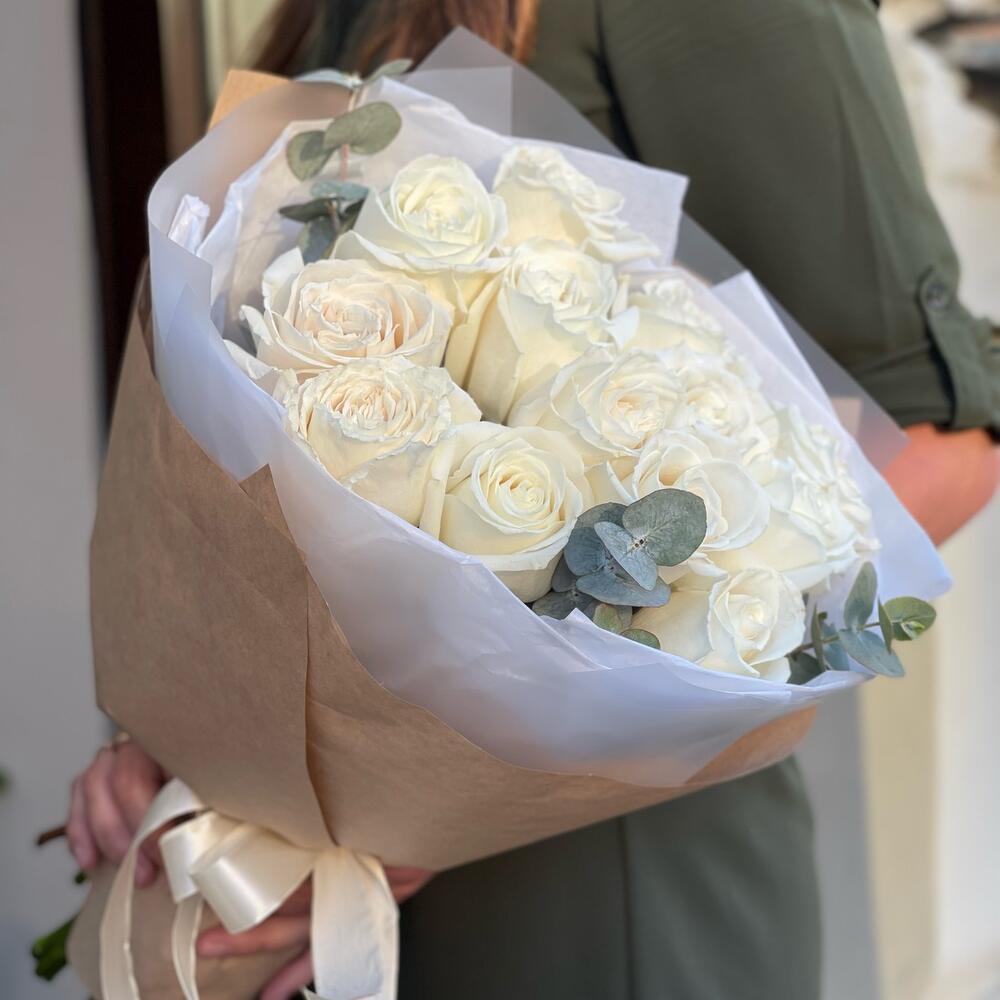 Эвкалипт – 1 шт.Роза одноголовая – 13 шт.Лента атласная – 1 шт.Тишью – 1 шт.Упаковка дизайнерская – 1 шт.