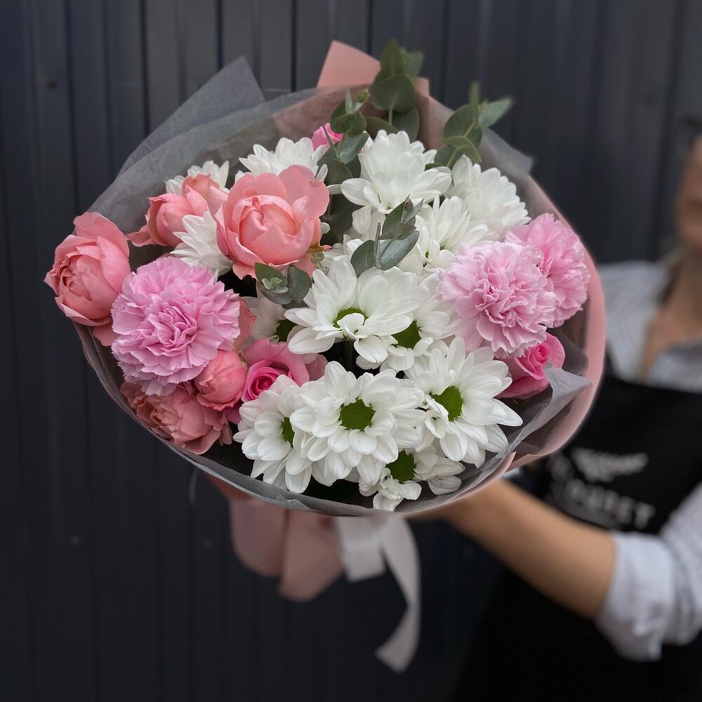 Категории: Гвоздики, Пионовидные розы, Розы, Хризантемы
