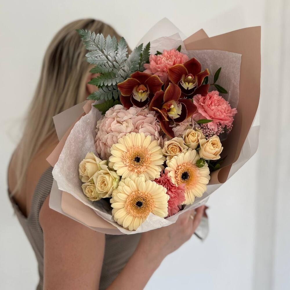 Гортензия – 1 шт.Озотамнус – 1 шт.Папоротник – 1 шт.Роза кустовая – 2 шт.Гербера – 3 шт.Диантус – 3 шт.орхидея – 3 шт.Дизайнерская упаковка – 3 шт.