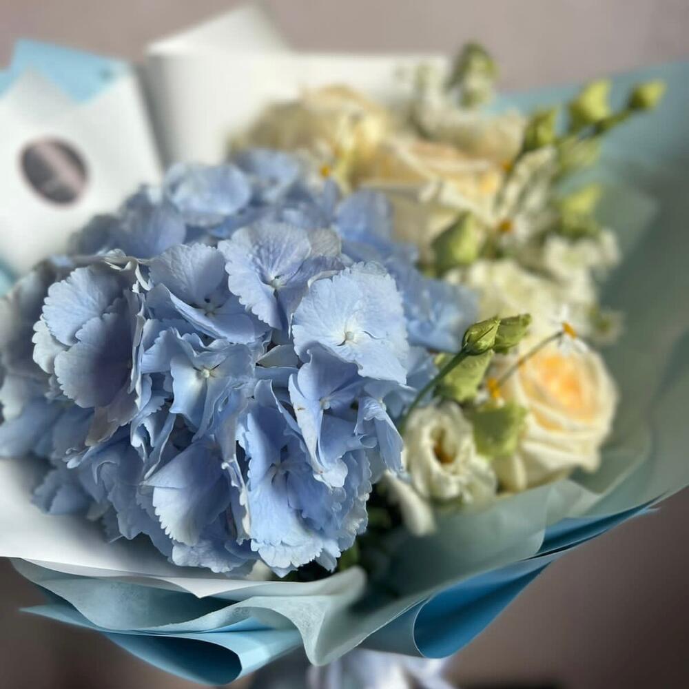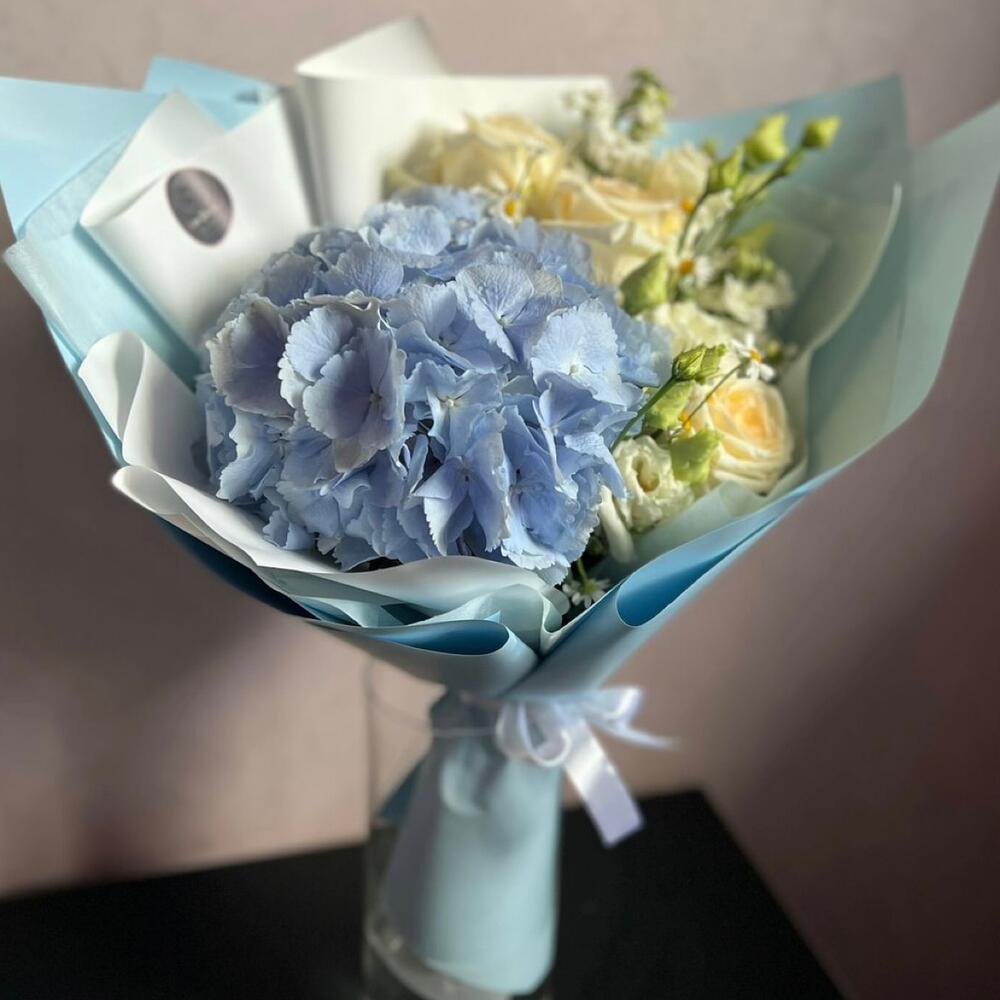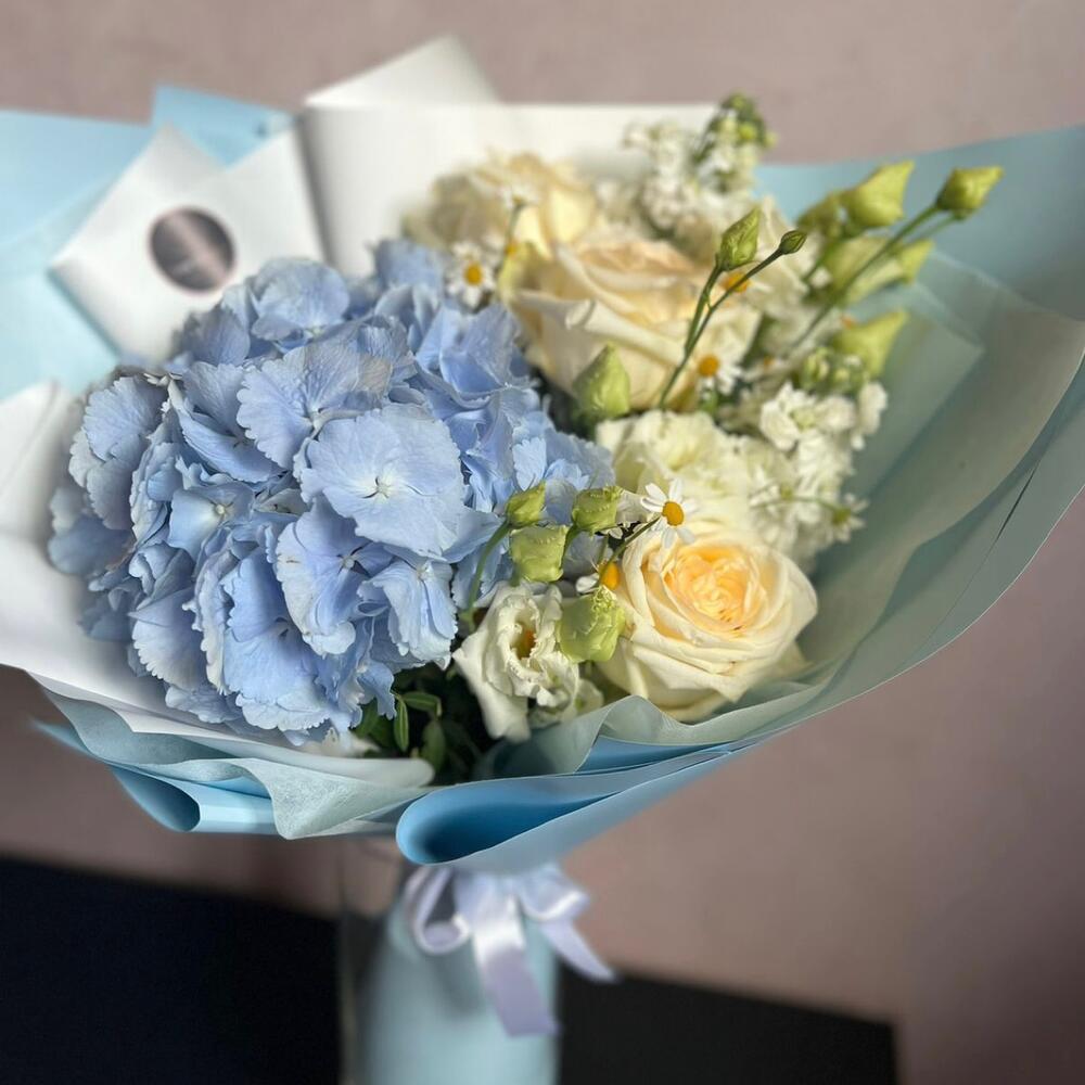 Гортензия голубая – 1 шт.Маттиола белая – 2 шт.Лизиантус (эустома) – 1 шт.Ромашка танацетум – 1 шт.роза кендлайт – 3 шт.Дизайнерская упаковка – 2 шт.Лента – 1 шт.подкормка для срезанных цветов – 1 шт.