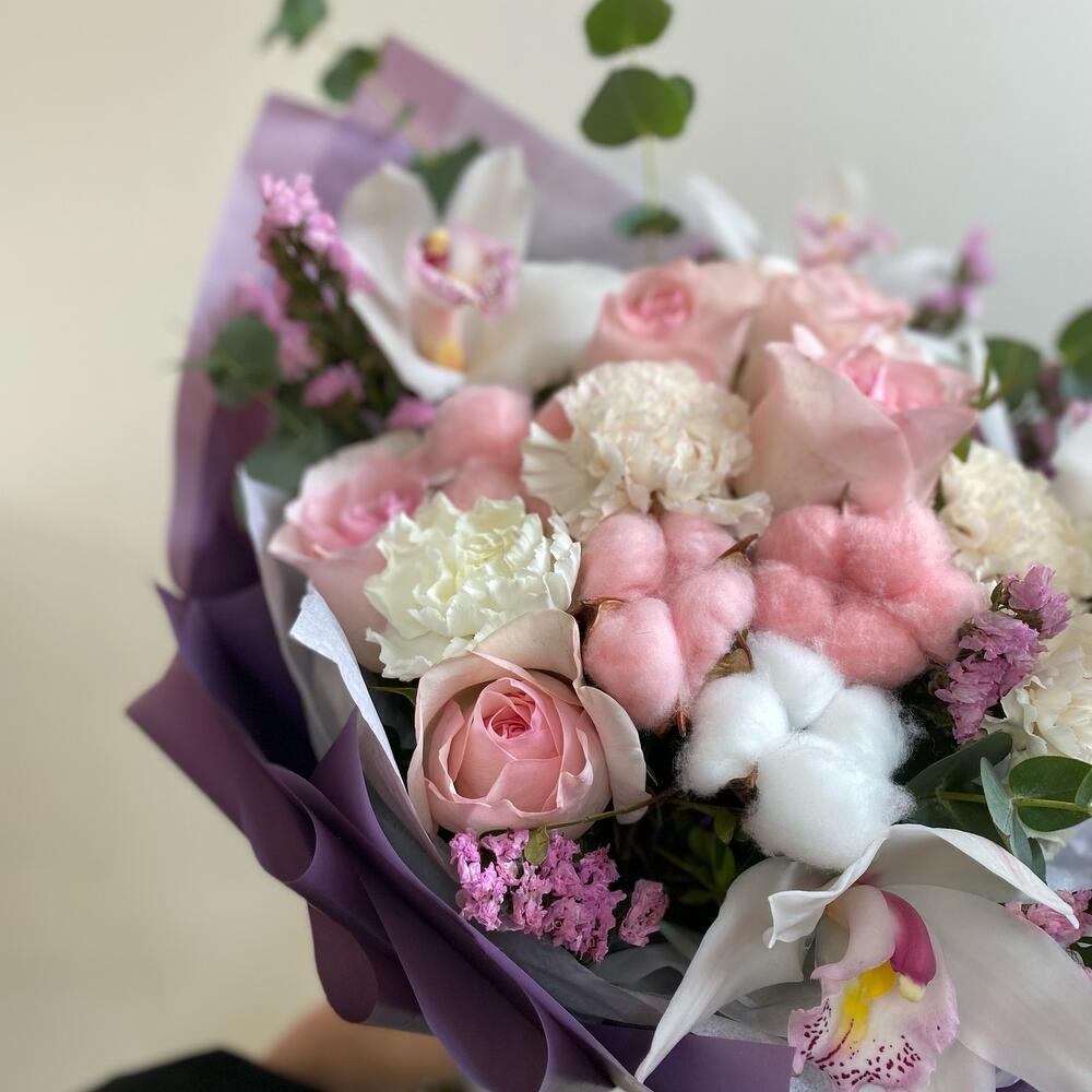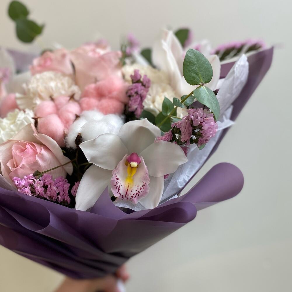 Орхидея Цимбидиум – 5 шт.Роза – 5 шт.Зелень – 4 шт.Упаковка – 8 шт.Лента атласная – 2 шт.Тишью – 4 шт.Статица белая – 6 шт.Гвоздика сортовая – 5 шт.Хлопок натуральный – 4 шт.