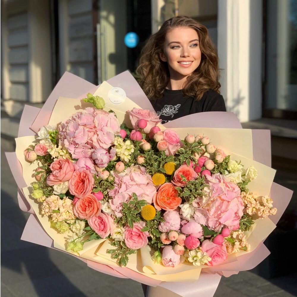 Гортензия – 3 шт.Кустовая пионовидная роза – 10 шт.Пион – 7 шт.Пионовидная роза – 10 шт.Лизиантус – 5 шт.зелень декоративная – 6 шт.Упаковка дизайнерская – 12 шт.Атласная лента – 2 шт.Аквабокс – 1 шт.транспортировочная упаковка – 1 шт.пленка транспортировочная – 1 шт.