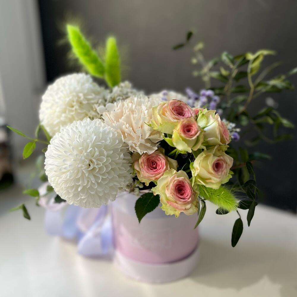 Альстромерии, Гортензии, Кустовые розы, Лизиантусы, Розы, Хризантемы