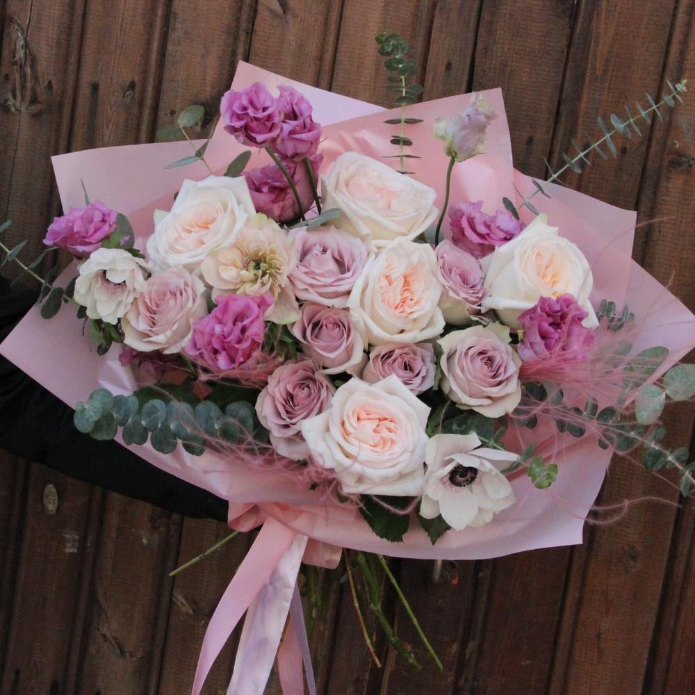 Анемон – 3 шт.Роза пионовидная – 5 шт.Роза – 7 шт.Лизиантус – 3 шт.Ковыль – 2 шт.Фисташка – 3 шт.Эвкалипт – 7 шт.Упаковка – 2 шт.Лента атласная – 2 шт.
