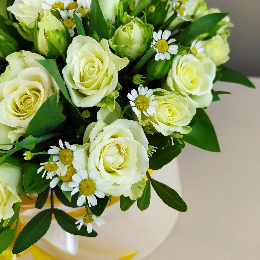 Роза кустовая – 10 шт.Зелень – 3 шт.Лента атласная – 3 шт.Коробка шляпная – 1 шт.Матрикария – 3 шт.