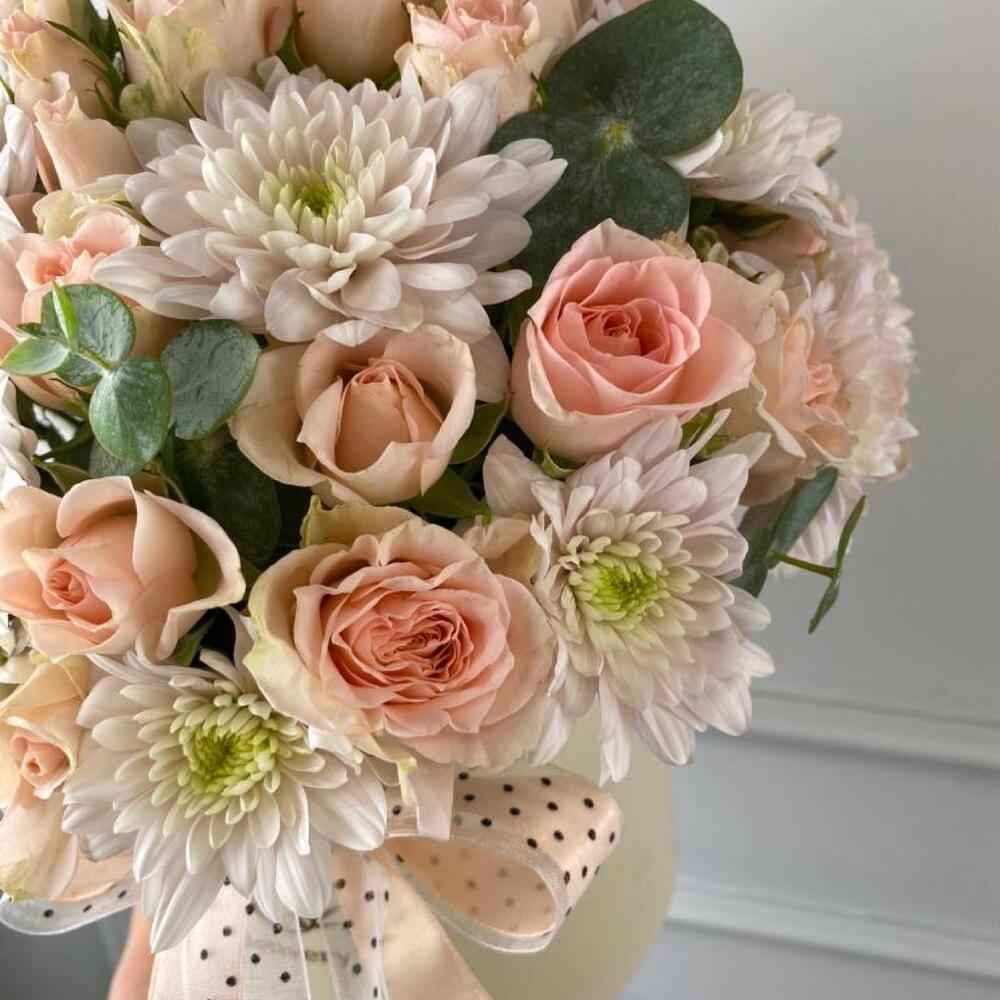 цилиндр м – 1 шт.Хризантема Балтика – 3 шт.Роза кустовая – 7 шт.Эвкалипт пучок – 1 шт.Оазис флористический – 1 шт.Лента – 1 шт.